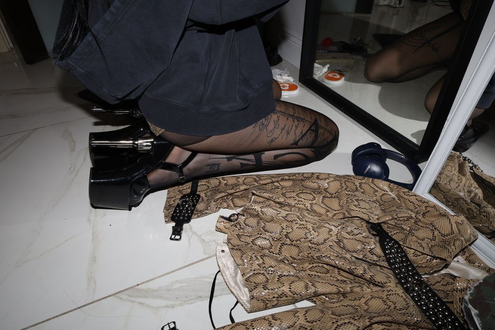 For her Fall 2025 collection, Kim Shui had sensuality, restraint, resistance, power, control and identity in mind. Inspired by artist Monica Bonvicini's work using leather belts and handcuffs, laser cut pleather was distressed and sliced in Western and East Asian-inspired pieces.