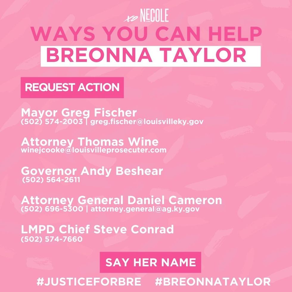 Kentucky Governor Andy Beshear, Louisville Mayor Greg Fischer, Commonwealth's Attorney Thomas Wine and Kentucky Attorney General Daniel Cameron all need to hear from you, demanding they do everything they can to secure justice for Taylor. The petitions circulating can serve as a phone and email script. The Action Pac's website StandWithBre.com also has a handy feature for making calls through their website, or see their contacts below.