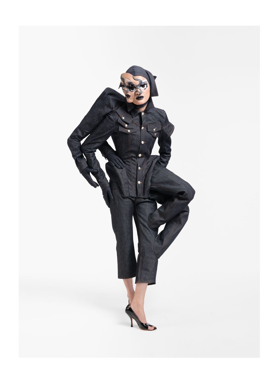 For Hungry, it was all about blending multiple bodies into one. Its "anatomical distortion" was inspired by the city’s movements and the artist’s signature morphed musings, aiming to present an illusion of a body in motion, phasing through another body. “With denim being so omnipresent in our lives and so versatile in use, it was my challenge to see how to make it my own in a way that seemed authentic and fresh.”