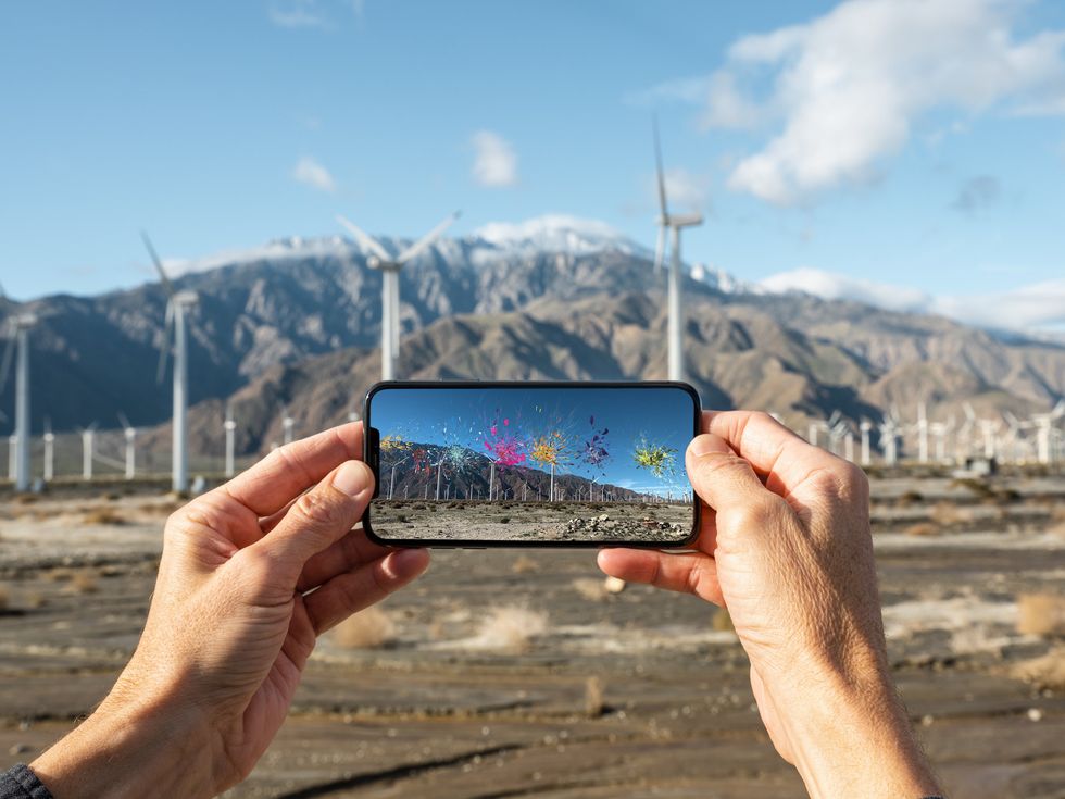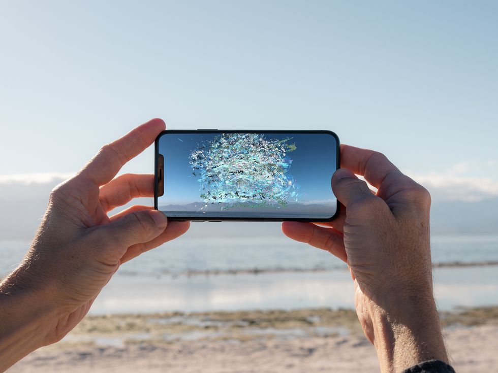 Depending on where you are and the moment you're in, you can see either pixelated explosions of blooms or fireworks — or what looks like waves of water, cascading or crashing, not unlike the surreal beauty and terror of a hurricane. "Still, when we use the phone as a means of viewing these things, the phone draws the work to you," Cahill tells PAPER. "It's asking you consider the landscape...that's the beauty of AR, is there's no environmental harm beyond the electricity needed to download the app, or driving your car to the site. It's sometimes inevitable these days, but if we can reduce the impact things have on the land itself, and allow viewers to think more consciously about the earth and our humanity, however fragile, then it's a step in the right direction."