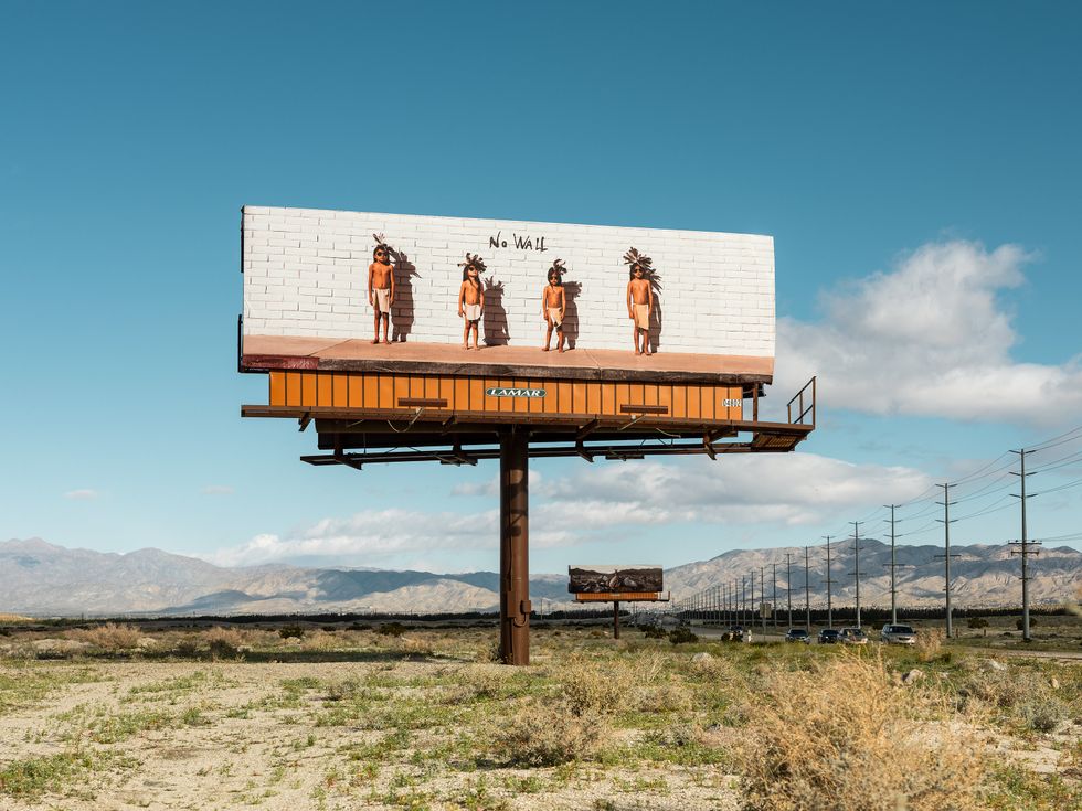 New Mexico-based artist and Chemehuevi tribal citizen Cara Romero's work is certainly among the most important at Desert X, given this year's noted emphasis on Indigenous perspectives. Romero's work is often said to be a response to life in Indian Country, as she explores the complexities of Indigenous life and the women who anchor it. Her medium is impactful digital photography, and at Desert X, she has produced a series, Jackrabbit, Cottontail & Spirits of the Desert, across billboards lining Palm Springs' Interstate 10.