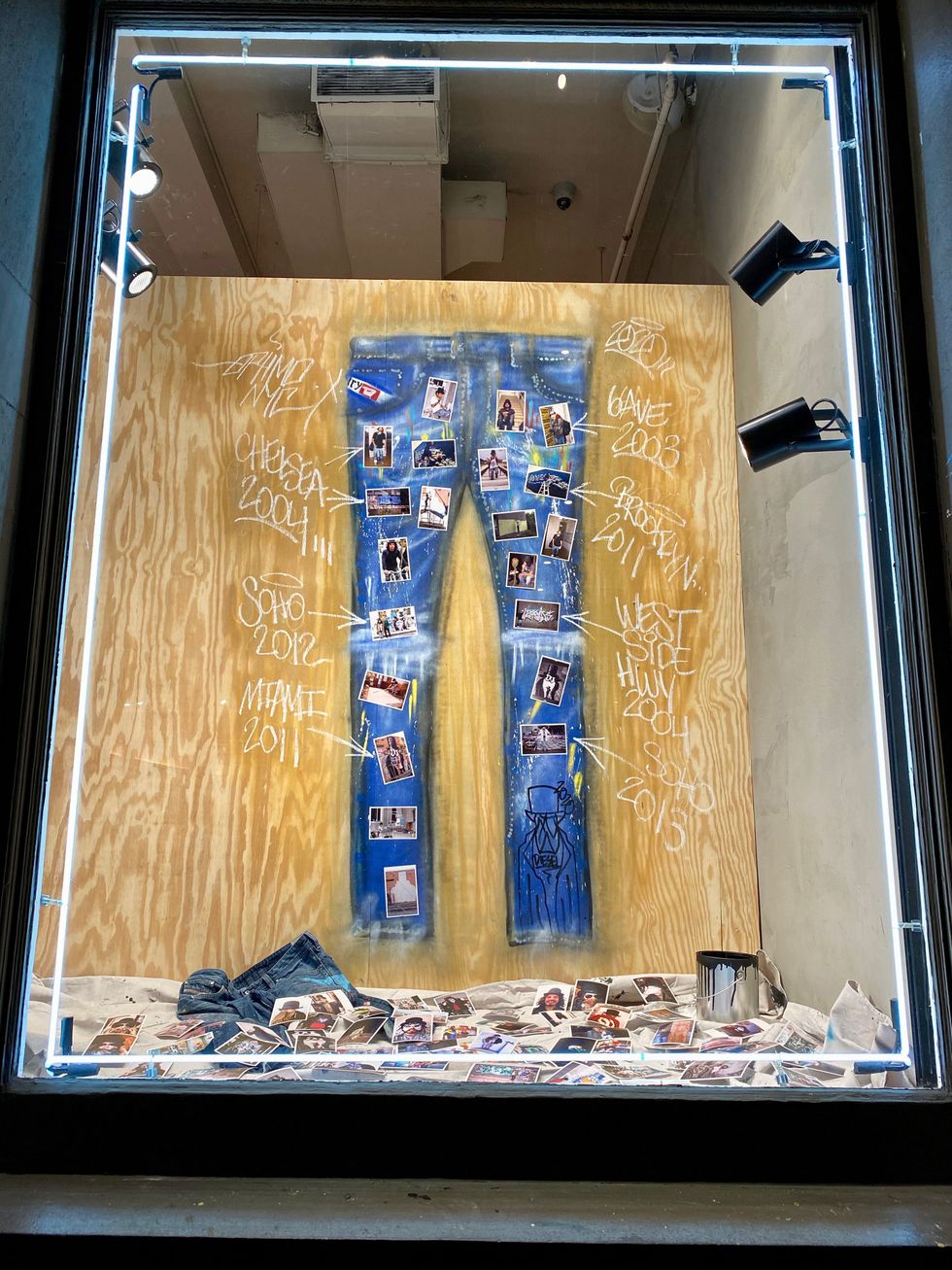 The display, which runs through October 31, consists of two windows: one with a painting of a pair of Diesel jeans layered with photographs of Optimo's life while in the brand's denim, and the other window depicting Optimo's aforementioned top hat and flag bandana-wearing persona. Inside, the store displays feature four pairs of men's and women's denim hand-painted by the artist.