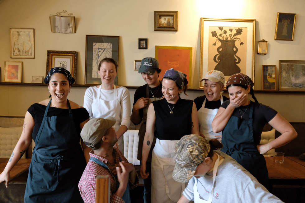 Cayle Montgomery found Dinner Party’s line through some Reddit research. They were looking for “Queer kitchens to work in” when the restaurant came up as a rec. “I went to culinary school then moved to the city to be immersed in art and food,” Montgomery says. When asked to describe their kitchen’s energy, the team’s answers were similar. “There’s a high sense of play,” admitted McNamara. “We literally play improv games,” Yates says. “It’s a circus,” Frauenfelder says. “Summer camp energy,” Oldani says. “I feel like I’m back on a playground,” Montgomery says. “It’s a microcosm of every TV show I watch,” Saha says.