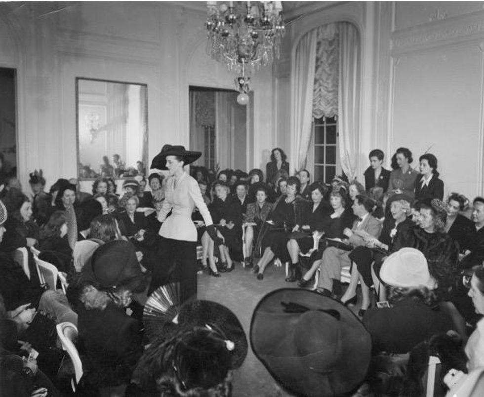 The first Christian Dior show showing a model wearing the Bar suit. (© Pat English)