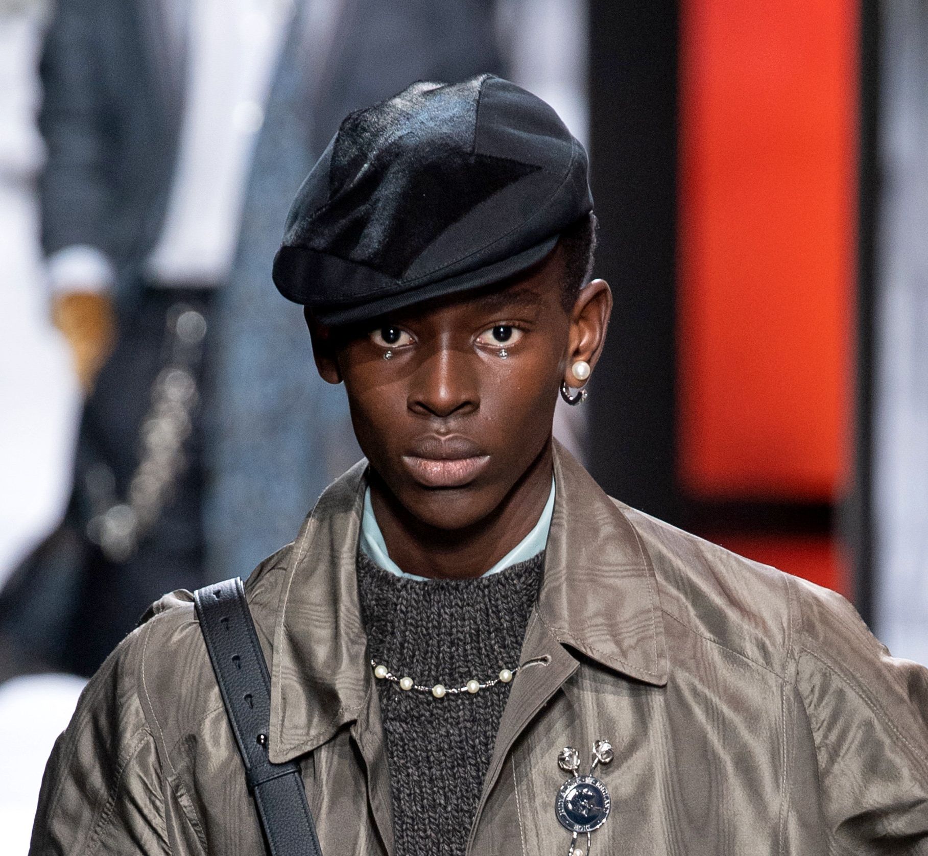 Dior teamed up with milliner Stephen Jones to design the hats for this collection, including one standout newsboy cap that featured a calf hair arrow, a reference to the famous arrow shape Blame shaved his head as.