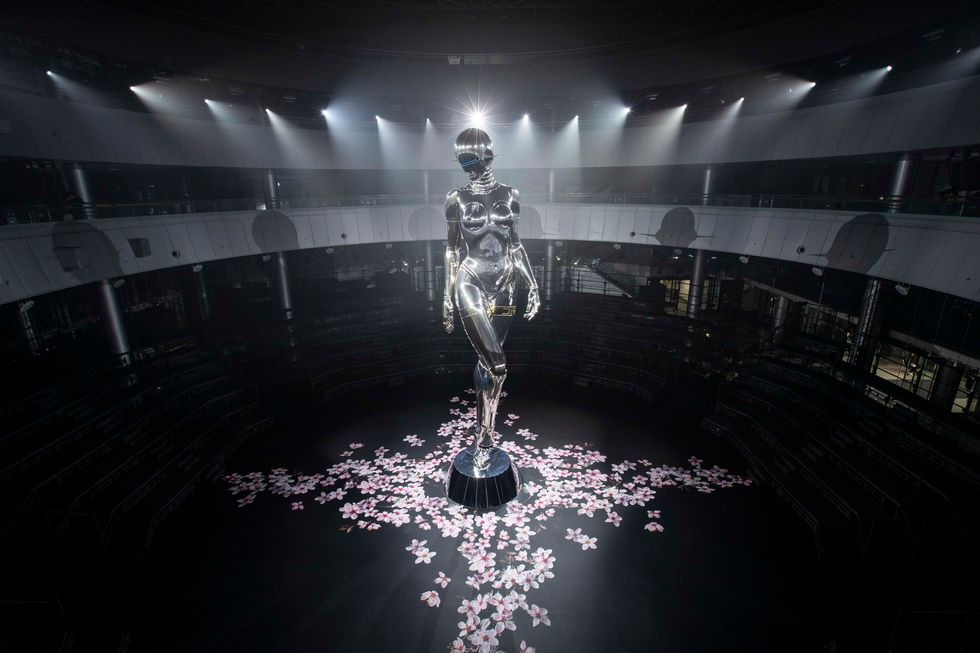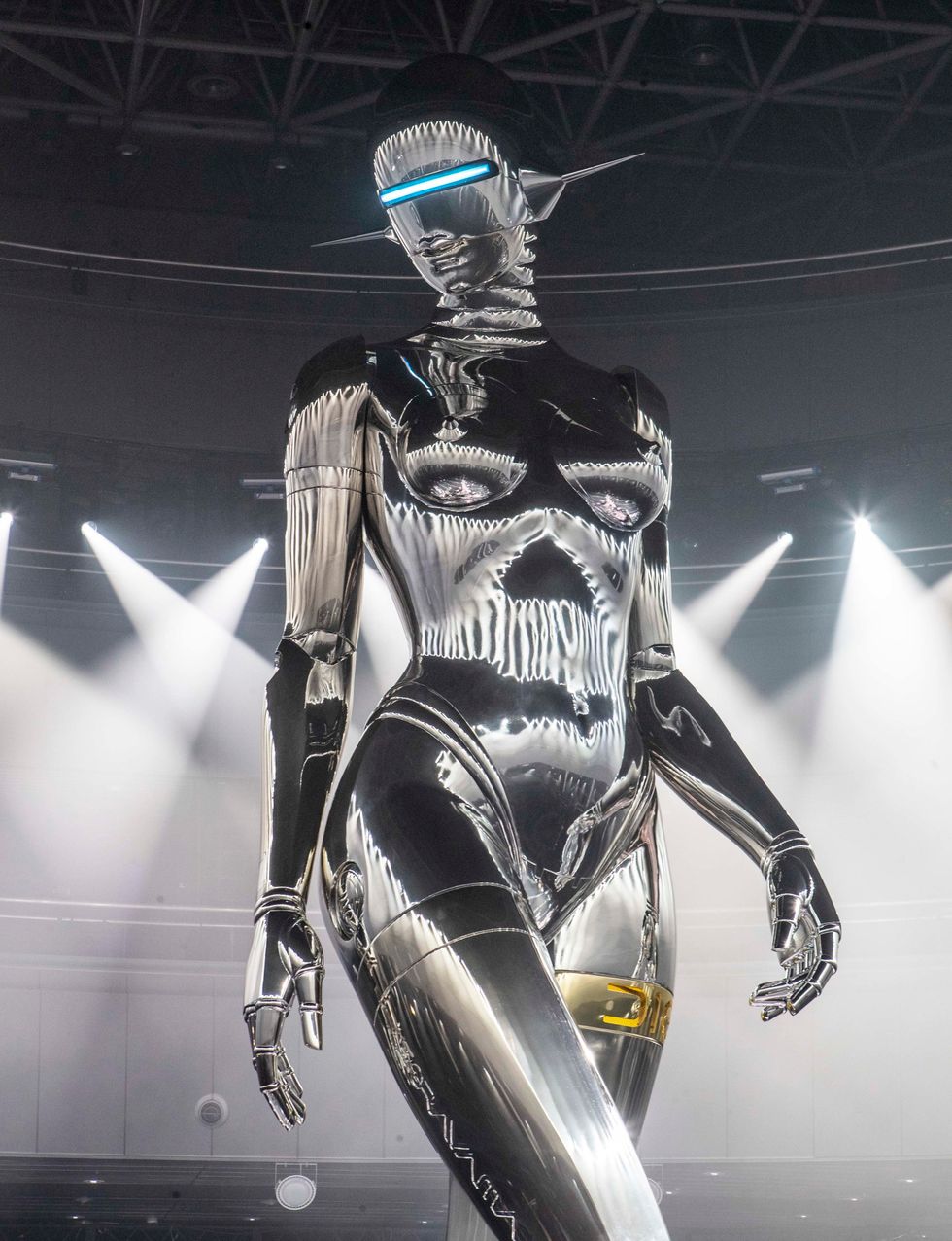 Today, Jones launched his pre-fall men's show in Tokyo, and took the city's advanced technological landscape to the next level. The set prominently featured a towering metallic female robot as its centerpiece, at just over 36 feet tall, sitting on a three-feet-high base, and conceived by Japanese contemporary artist, Hajime Sorayama. And of course a figure like that is quite heavy: at just over 20,000 pounds, it's well over 10 tons.