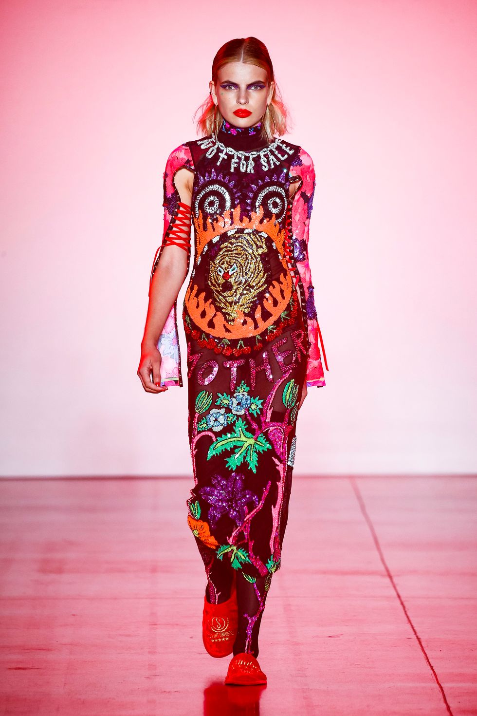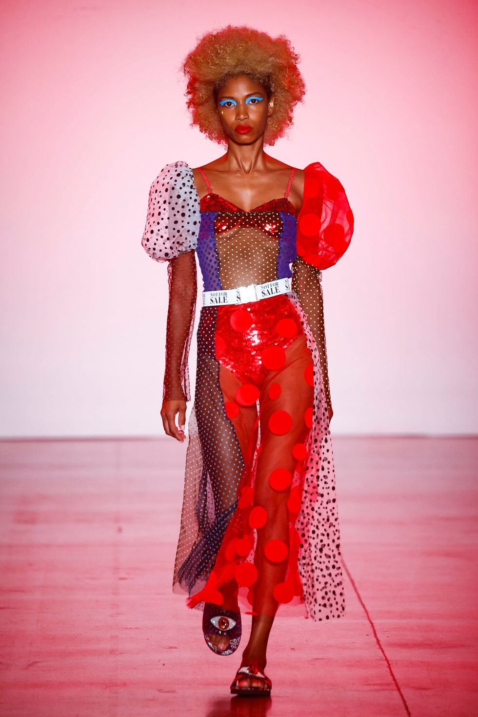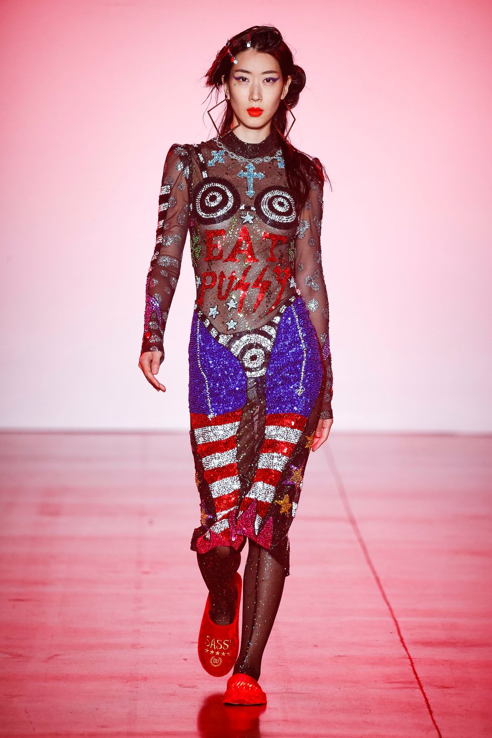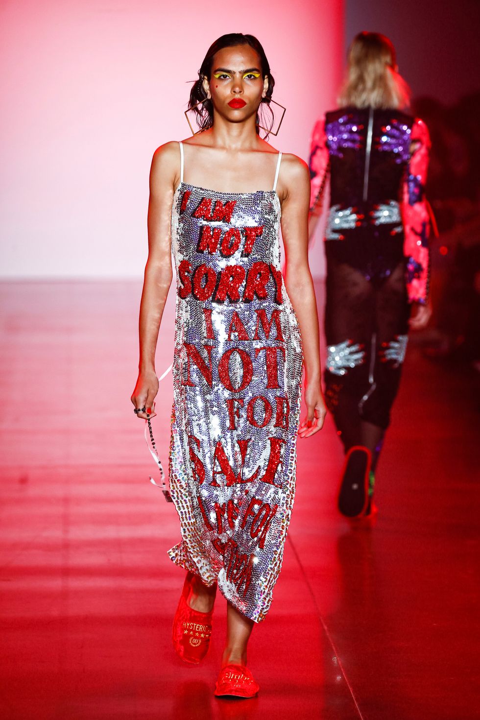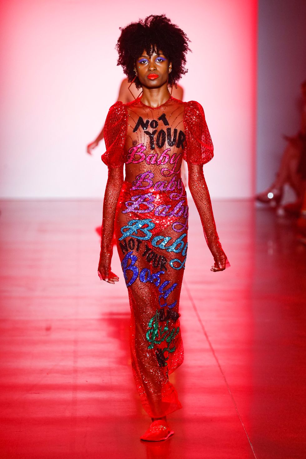 Multiple models wore pieces emblazoned with the phrase "Not for sale." DU garments are very much for sale! But as the show went on, it became clear that this was less a reference to late capitalism and more of a comment on gendered language. Dresses declared that they were "not sorry;" a slim fitting turtleneck was "forever emotional, crazy, irrational." James and Napreychikov really know how to reclaim a narrative. One sheer dress featured a sequined logo reading "eat pussy." Now that's a message we can get behind.