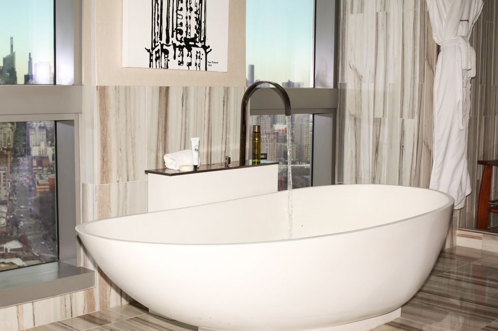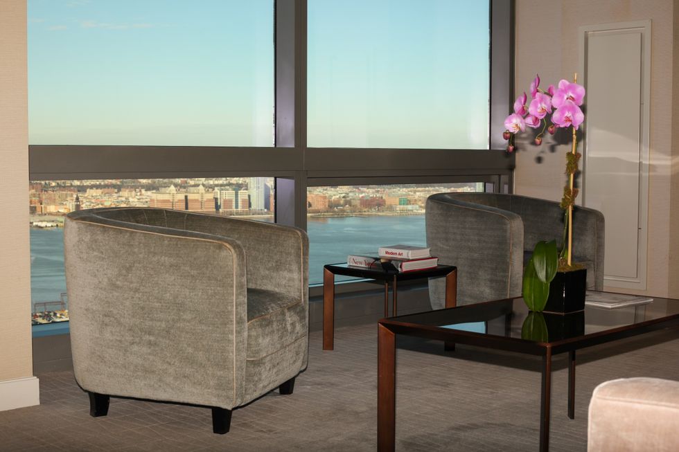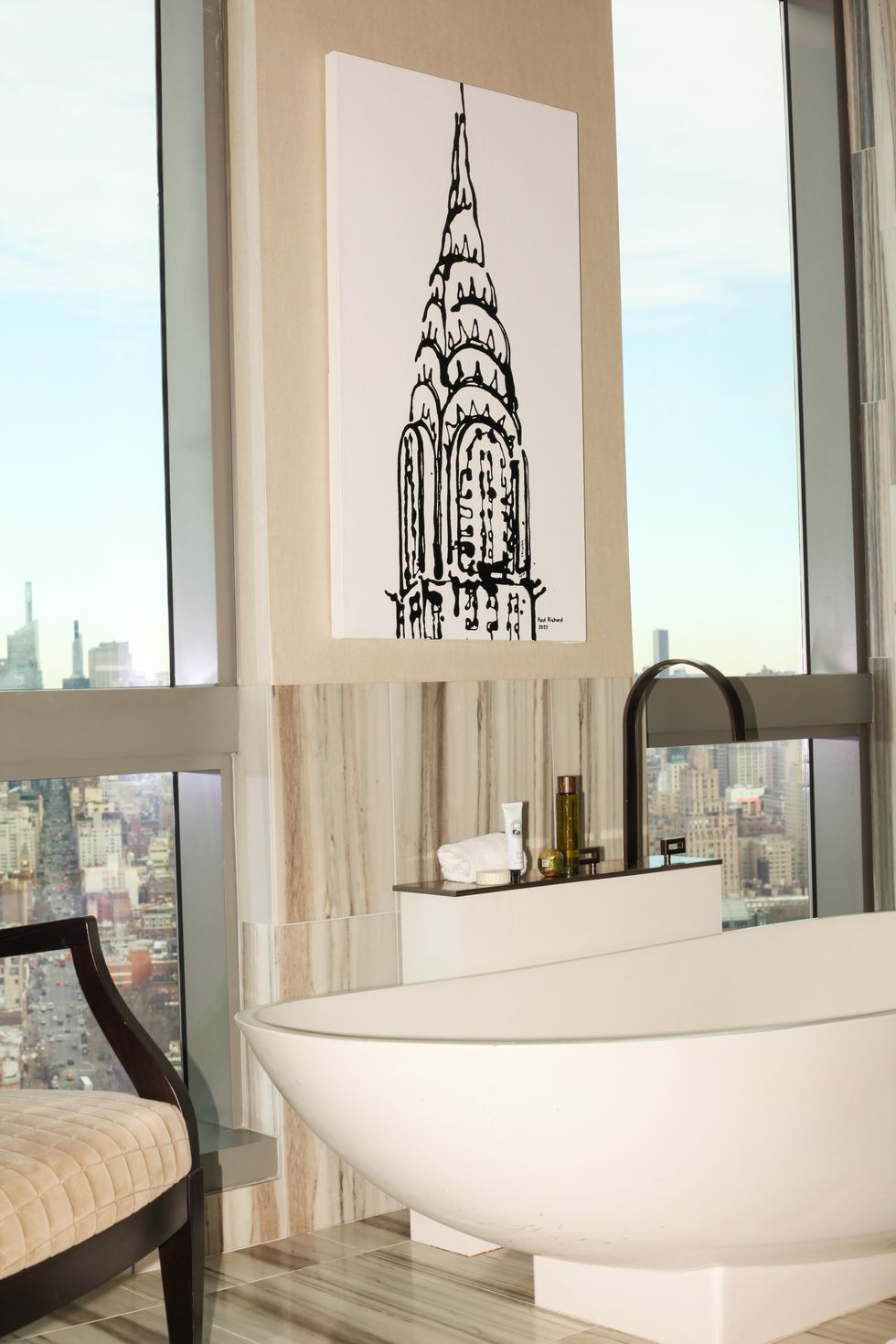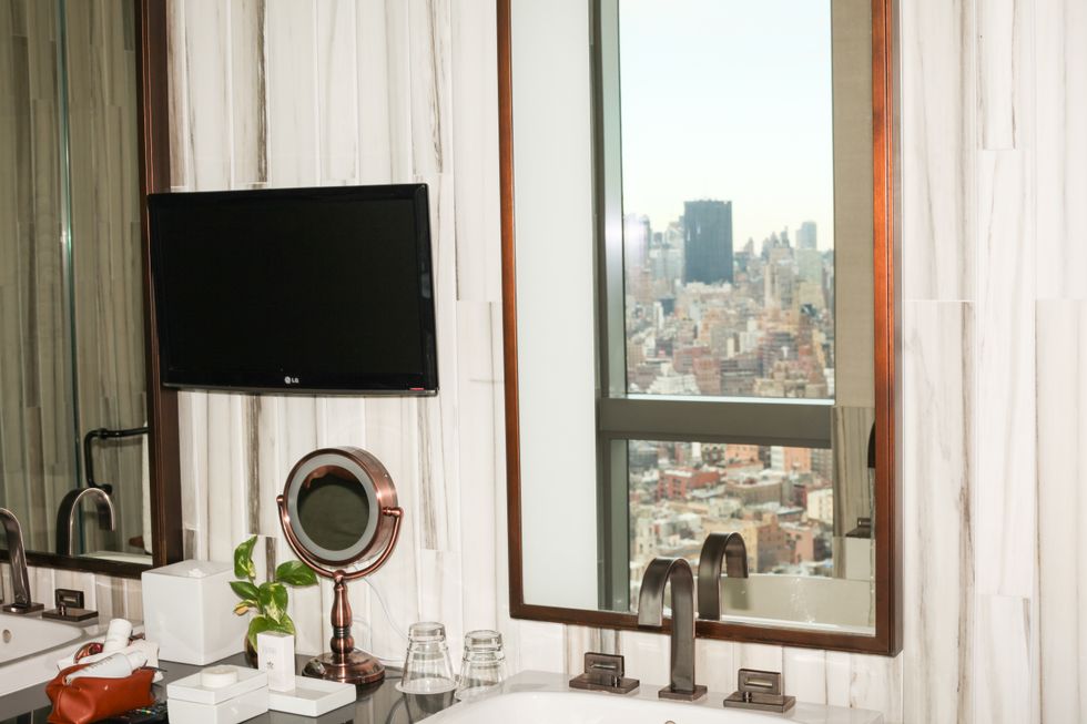 The hotel has also put in the work when it comes to leaning into what makes NYC so NYC. They’ve turned a penthouse suite into a full-on gallery, showing off artwork from street artist Paul Richard. While cosplaying as a singer-songwriter taking a break from an arduous (and successful... obviously) tour, the suite was PAPER’s perfect sound stage.