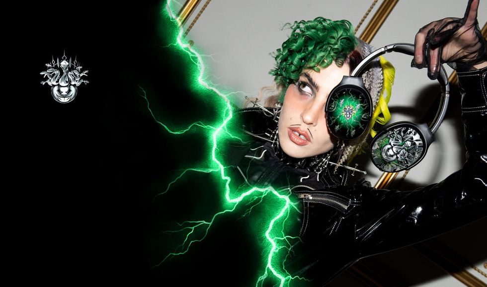 "I like to try to combine seemingly disparate things aesthetically or conceptually and make them mesh together," Electra says of the collaboration. "It's a fun challenge and also a good formula for when I feel creatively stuck. For my custom Skullcandy collection, we combined medieval and futuristic flavors, baroque and CGI slick — something I try to do in my music well. I get bored easily, so I like to have lots of variation to spice it up."