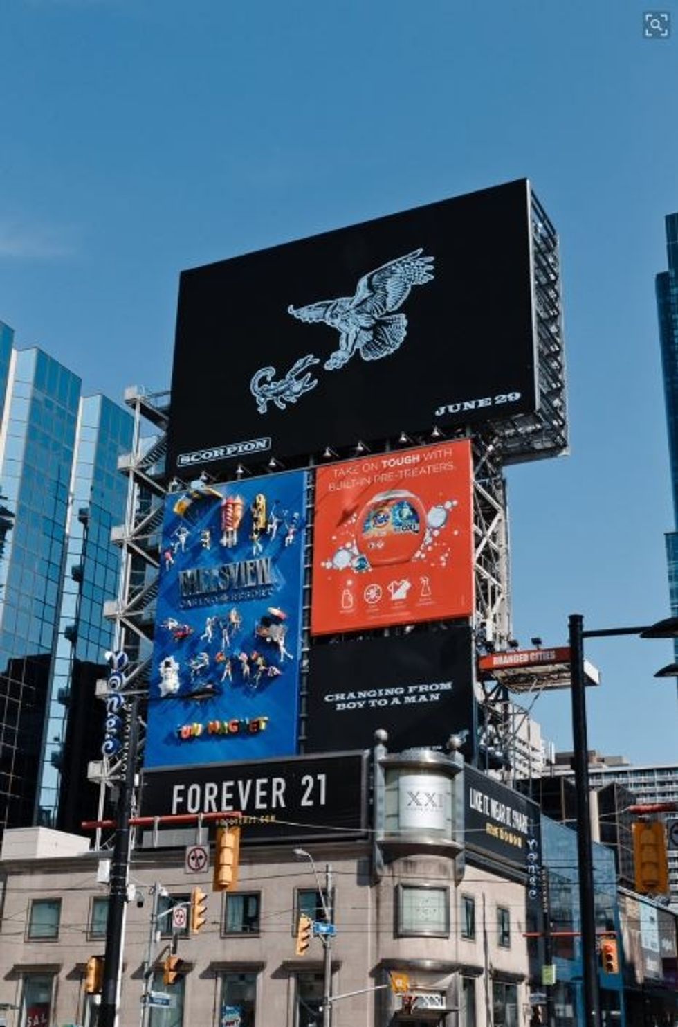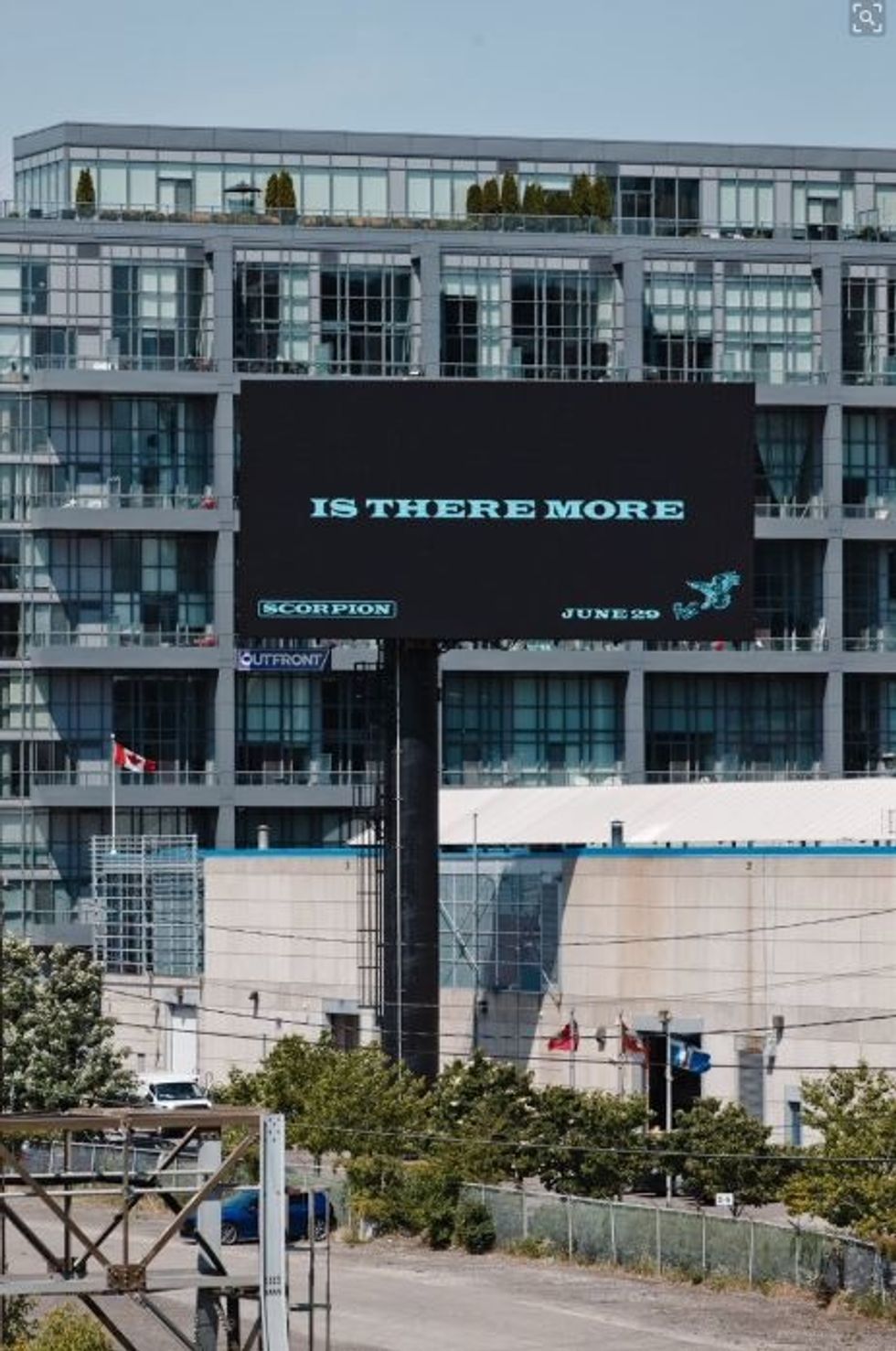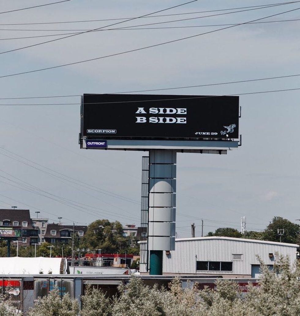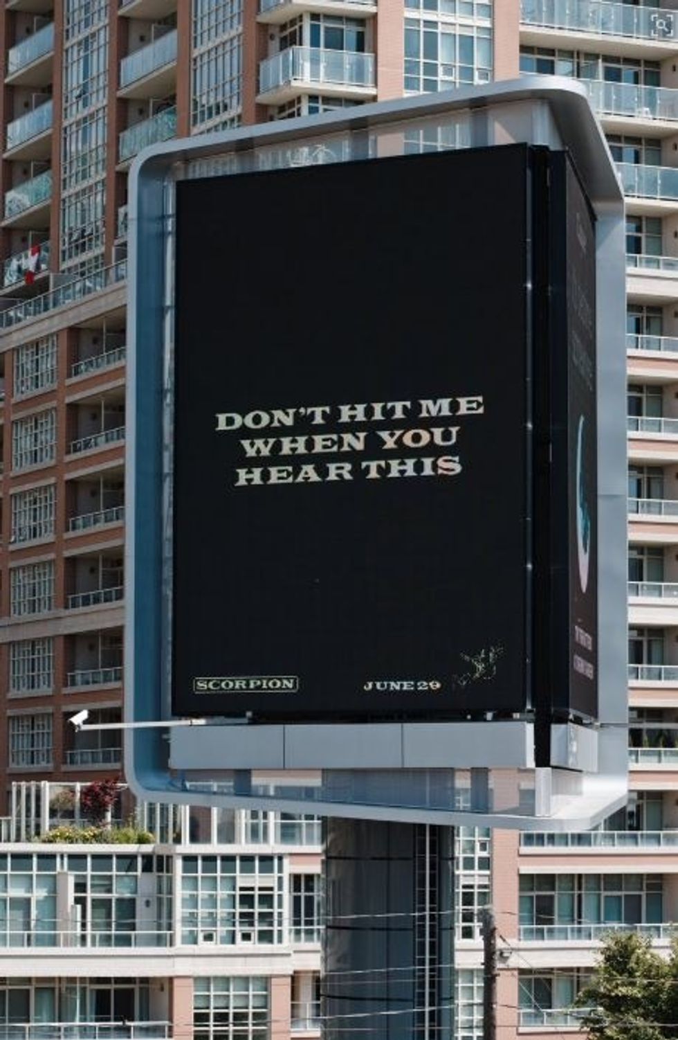 Scorpion, Drake's fifth studio album, is slated to be released this month — June 29, as we've learned from his Toronto-situated ads — and it looks to be a double album. The signs read "Side A Side B," "Don't hit me when you hear this," and "Is there more," another merely features an eagle landing, talons extended, on a scorpion.