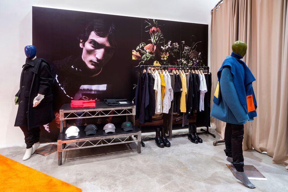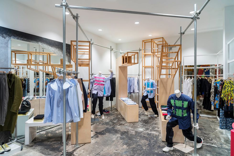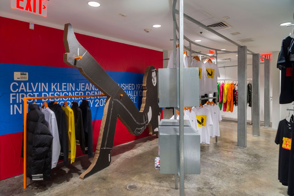 Each brand with dedicated space redesign edits section of the store for the retailer's most recent overhaul. Gucci's boutique was saturated with orange and Calvin Klein's new collection "Calvin Klein Jeans Est. 1978" was installed around a larger-than-life cardboard cutout of Brooke Shields. In addition to these updates, Kawakubo revamped Comme des Garçons's various space in the multilevel store. Three decorative pillars, a wooden one by London Fieldworks, a knit one by Magda Sayeg, and one made of recycled art by Leo Sewell extend from the ground floor to the sixth floor binding the contrasting spaces together.