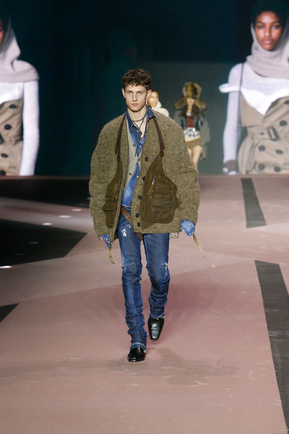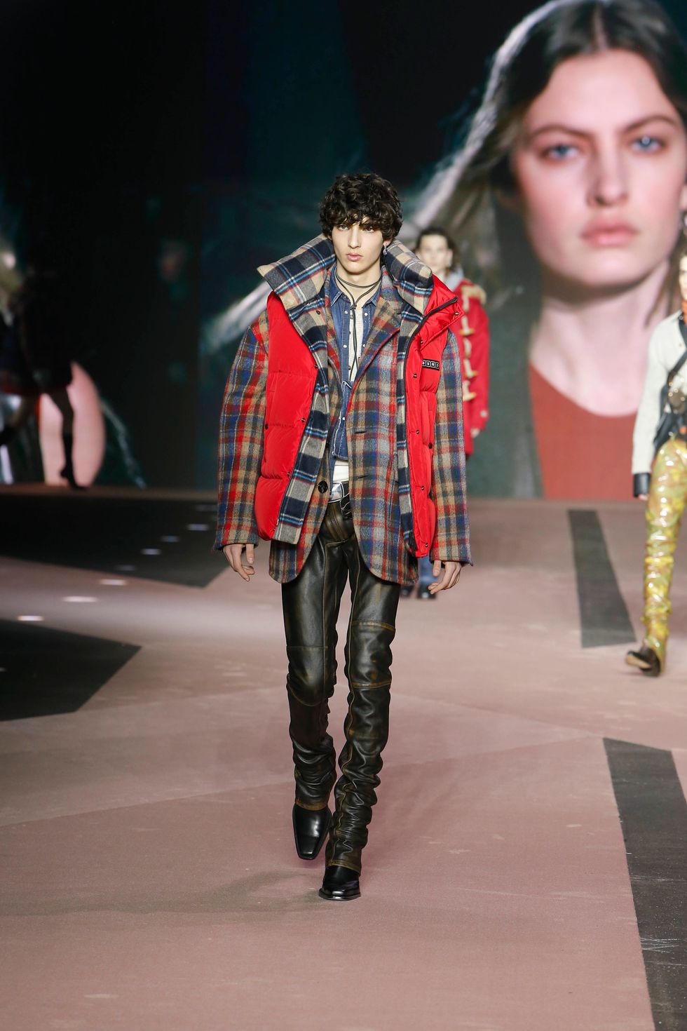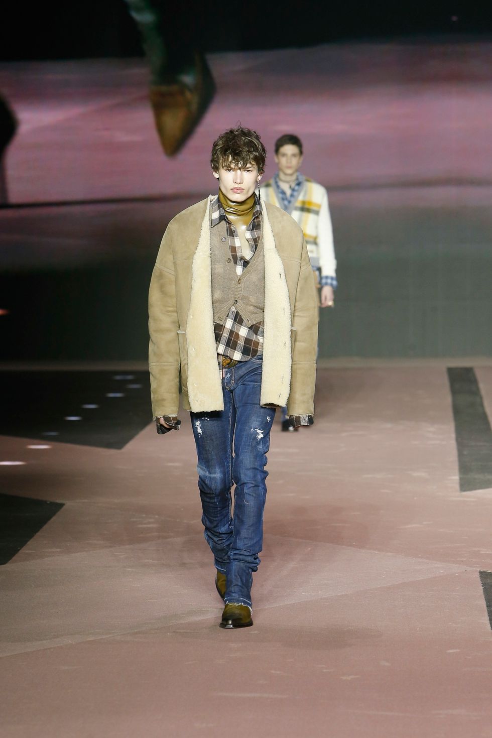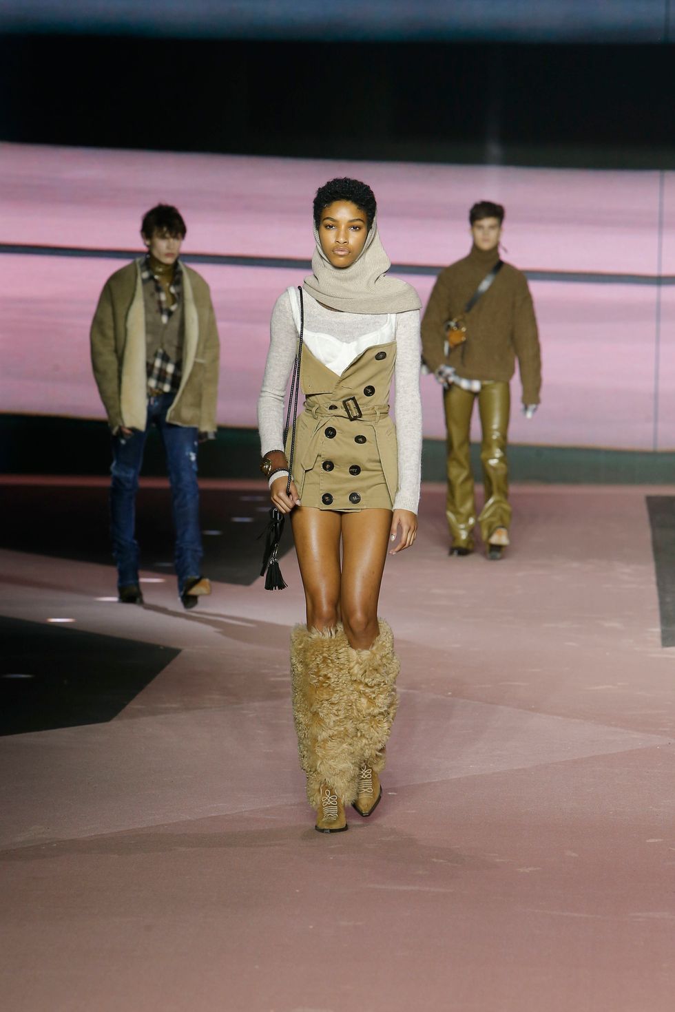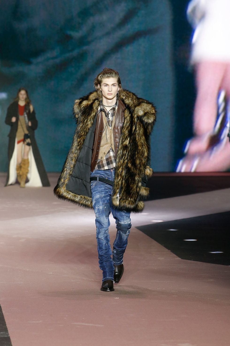 Naturally, the collection featured several references of the brand's past work, including Western gear, heavy layering, giant faux fur coats and low-rise jeans reinterpreted in modern ways for men and women. (Dsquared2 is one of the small few still showing co-ed collections on the lower-key menswear schedule.)