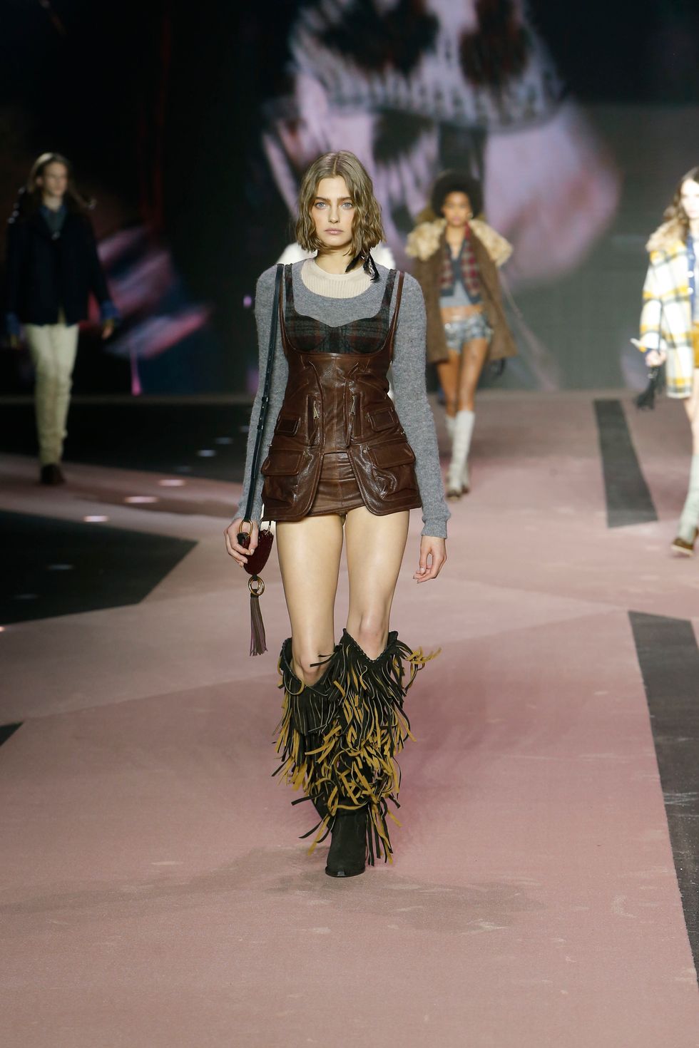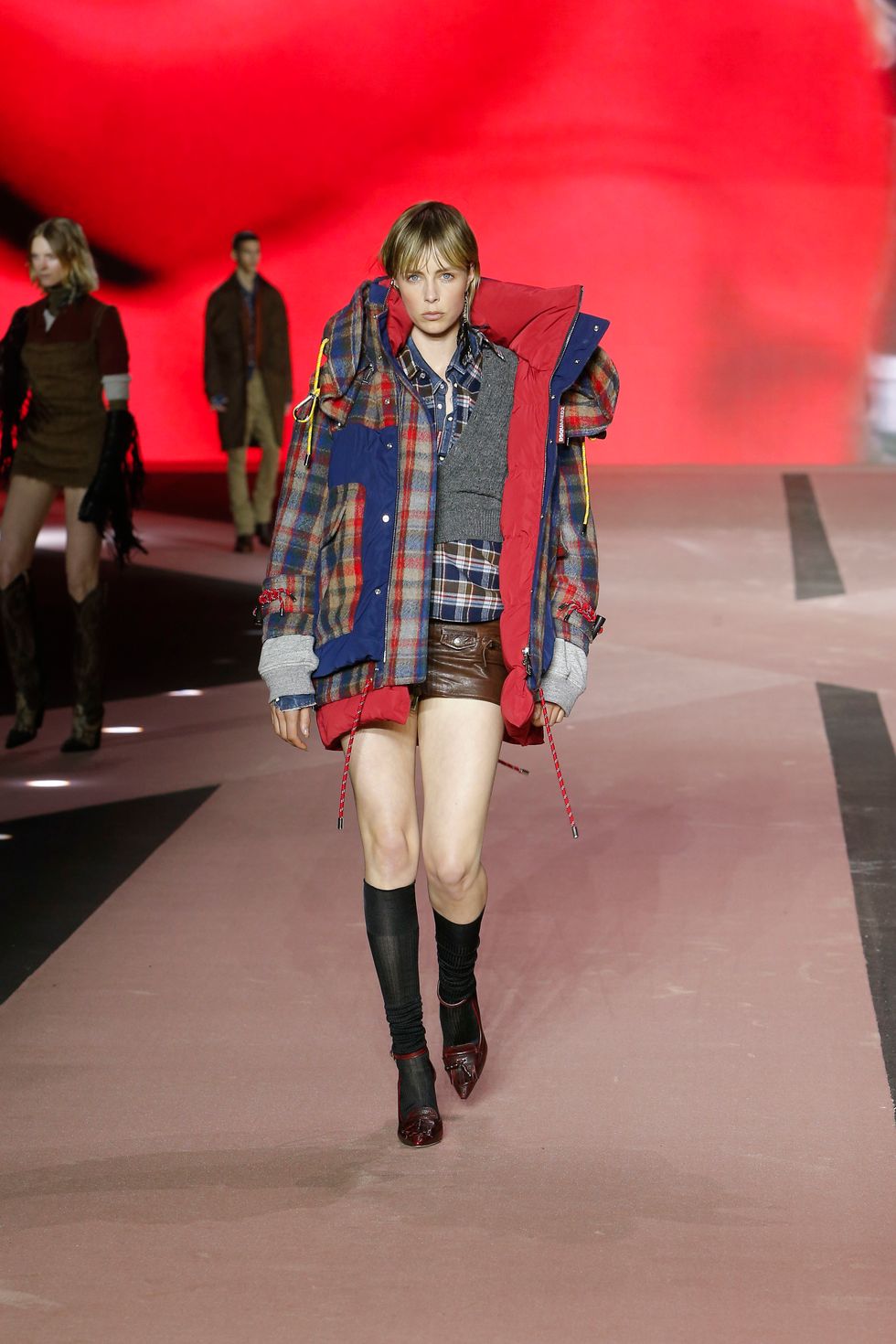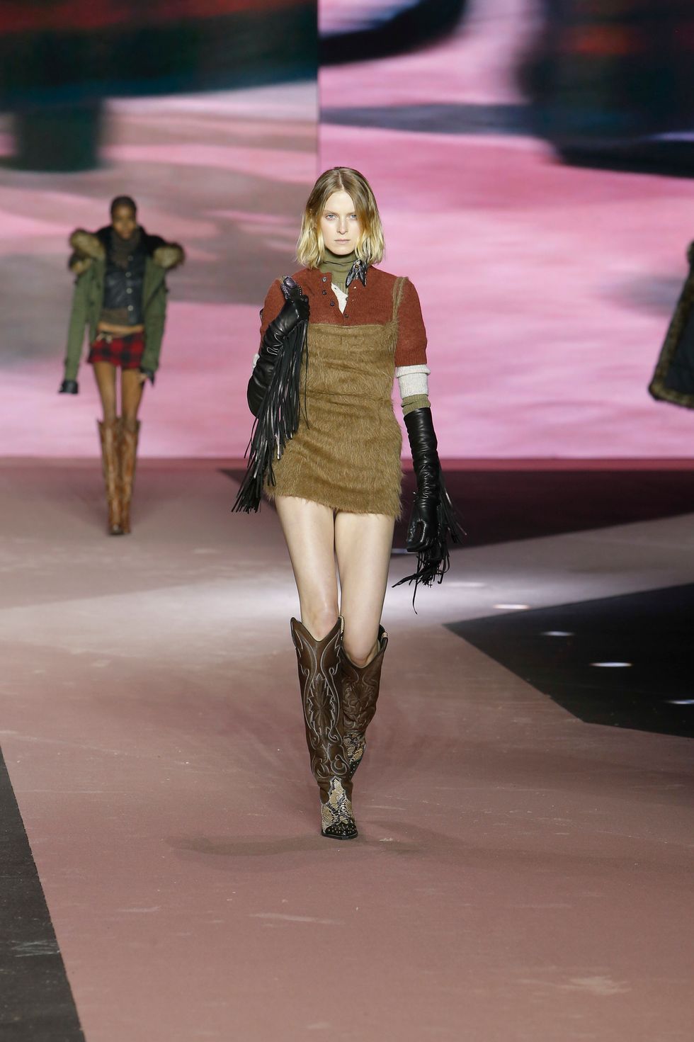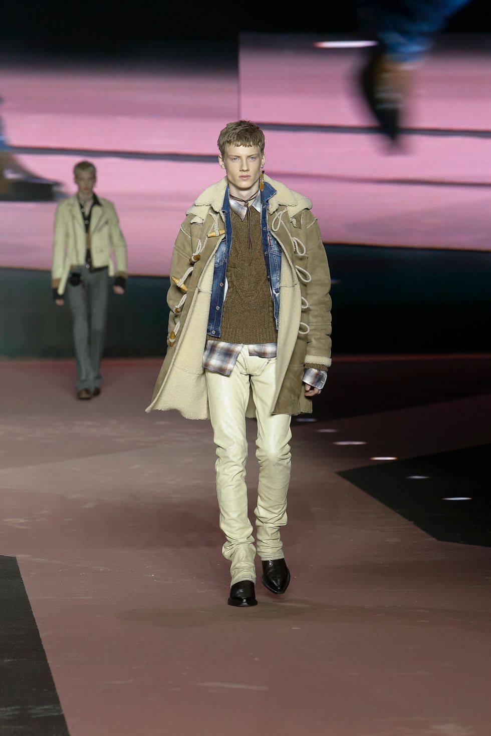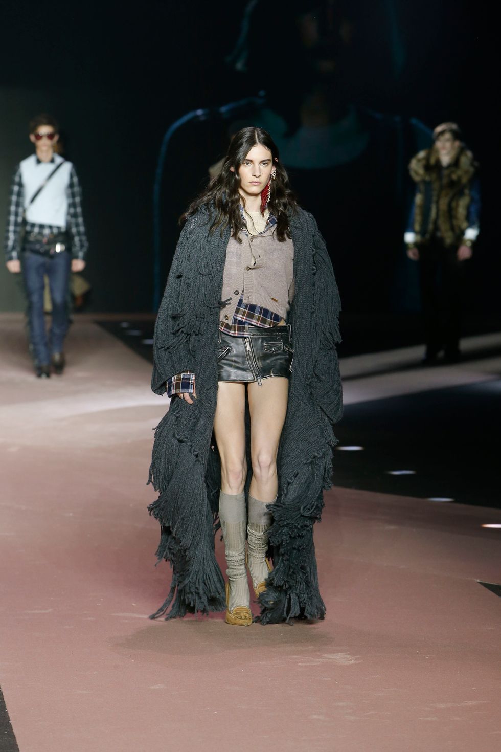 Naturally, the collection featured several references of the brand's past work, including Western gear, heavy layering, giant faux fur coats and low-rise jeans reinterpreted in modern ways for men and women. (Dsquared2 is one of the small few still showing co-ed collections on the lower-key menswear schedule.)