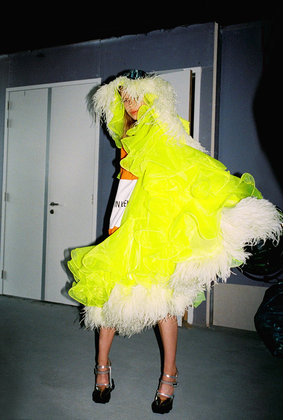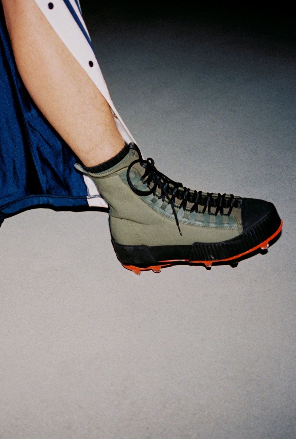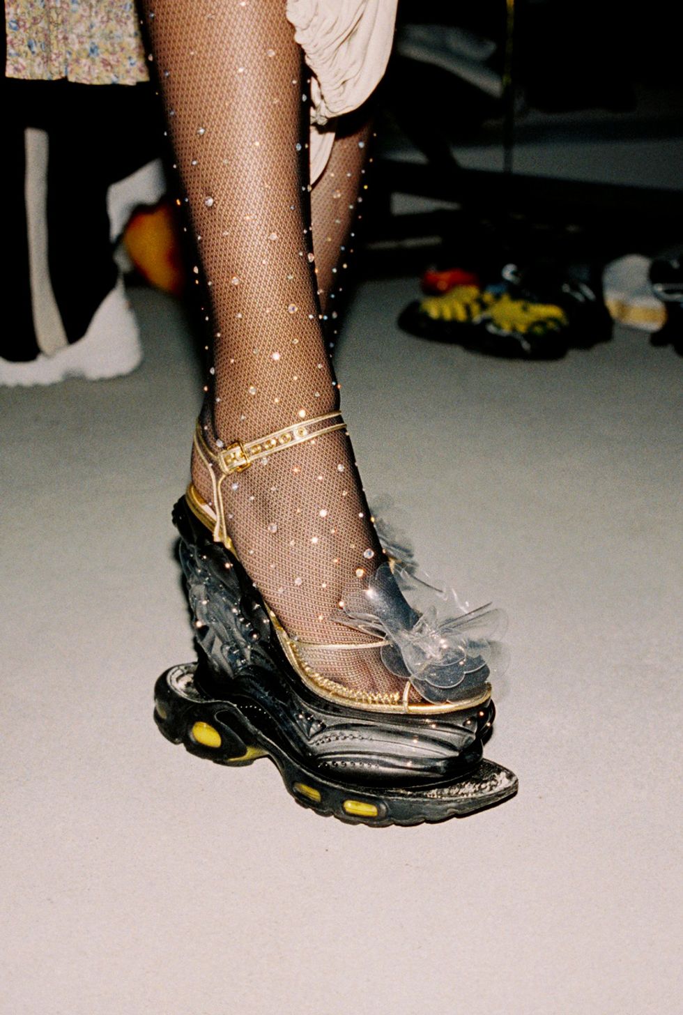 The resulting collection was an exciting grab bag of strange, multicolored silhouettes. "I think of it as a celebration of diversity," Lantink says, "and that's what makes it a collection," rather than a more traditional focused theme. An argyle sleeve sewn onto a turtleneck with a gold timepiece at the neck, worn with cream furry pants; layered men's boxers combined with intentionally sagging, oversized trousers; a puffer coat manipulated into a tight, poncho-style top; a sneaker bottom attached to a platform wedge attached to a gold strappy stiletto pump; workwear jumpsuits softened with dramatic layers of tulle. "We make everything in house and do a zero waste policy," Lantink says of the looks.