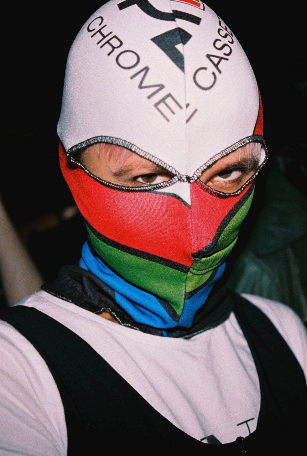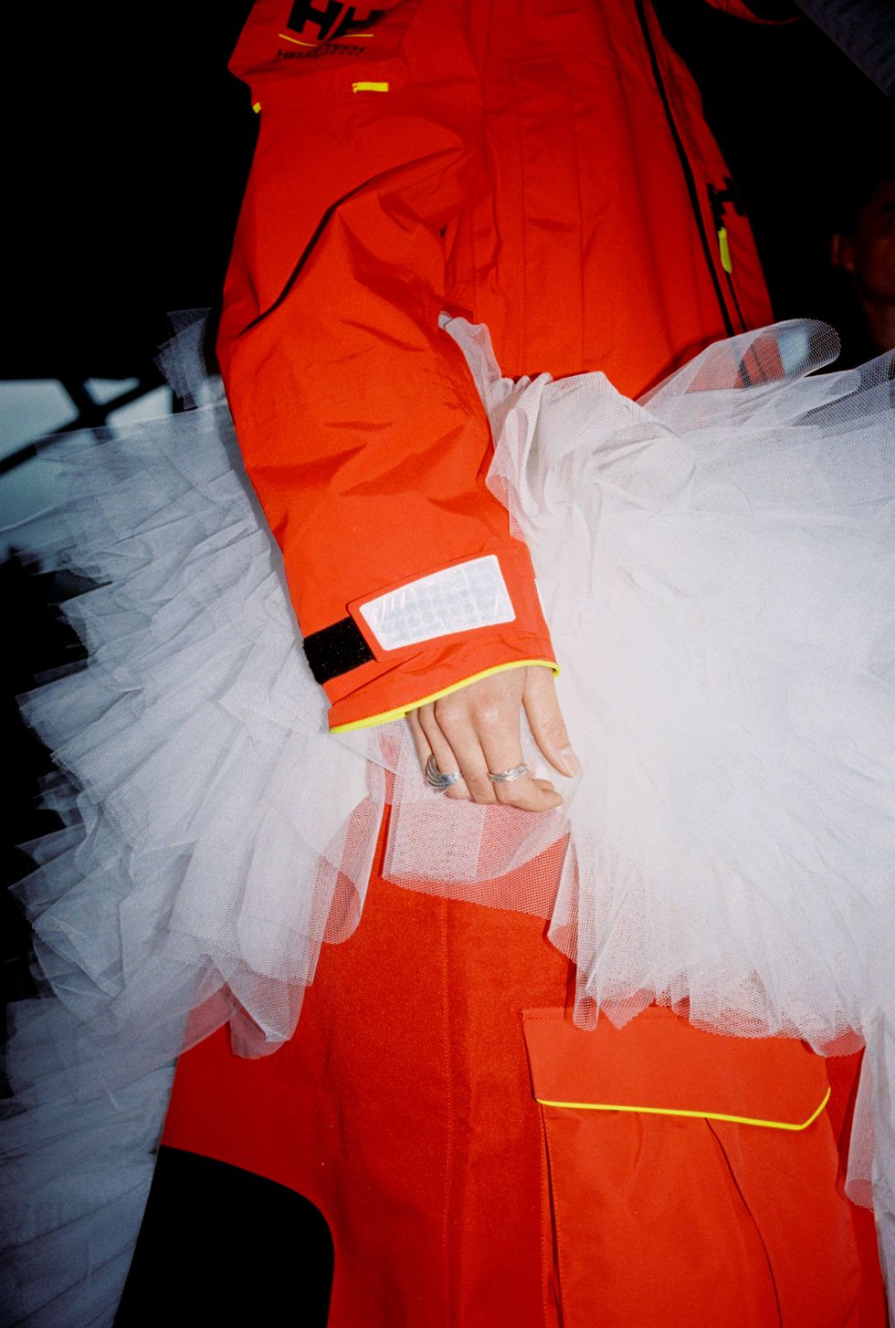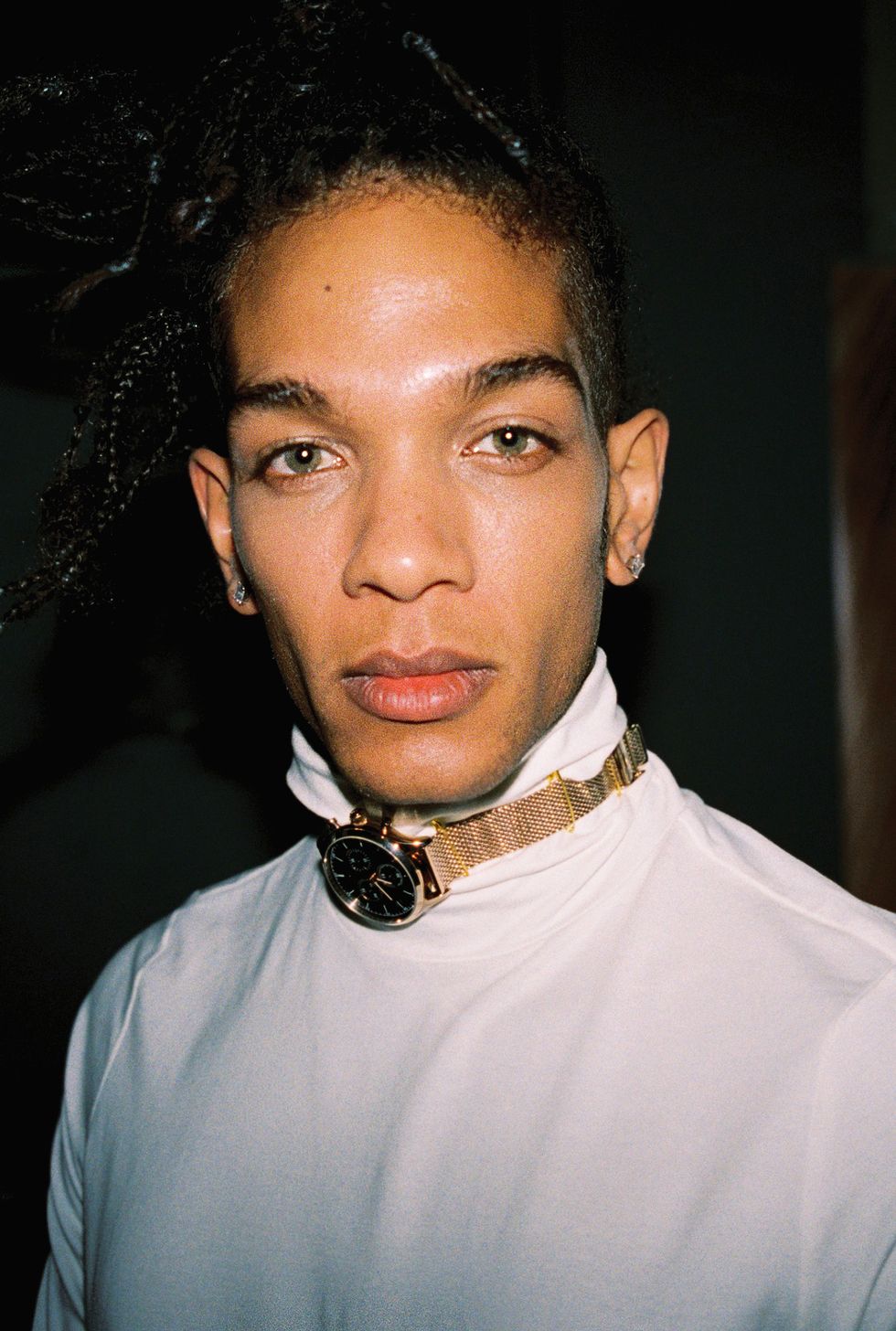 The resulting collection was an exciting grab bag of strange, multicolored silhouettes. "I think of it as a celebration of diversity," Lantink says, "and that's what makes it a collection," rather than a more traditional focused theme. An argyle sleeve sewn onto a turtleneck with a gold timepiece at the neck, worn with cream furry pants; layered men's boxers combined with intentionally sagging, oversized trousers; a puffer coat manipulated into a tight, poncho-style top; a sneaker bottom attached to a platform wedge attached to a gold strappy stiletto pump; workwear jumpsuits softened with dramatic layers of tulle. "We make everything in house and do a zero waste policy," Lantink says of the looks.