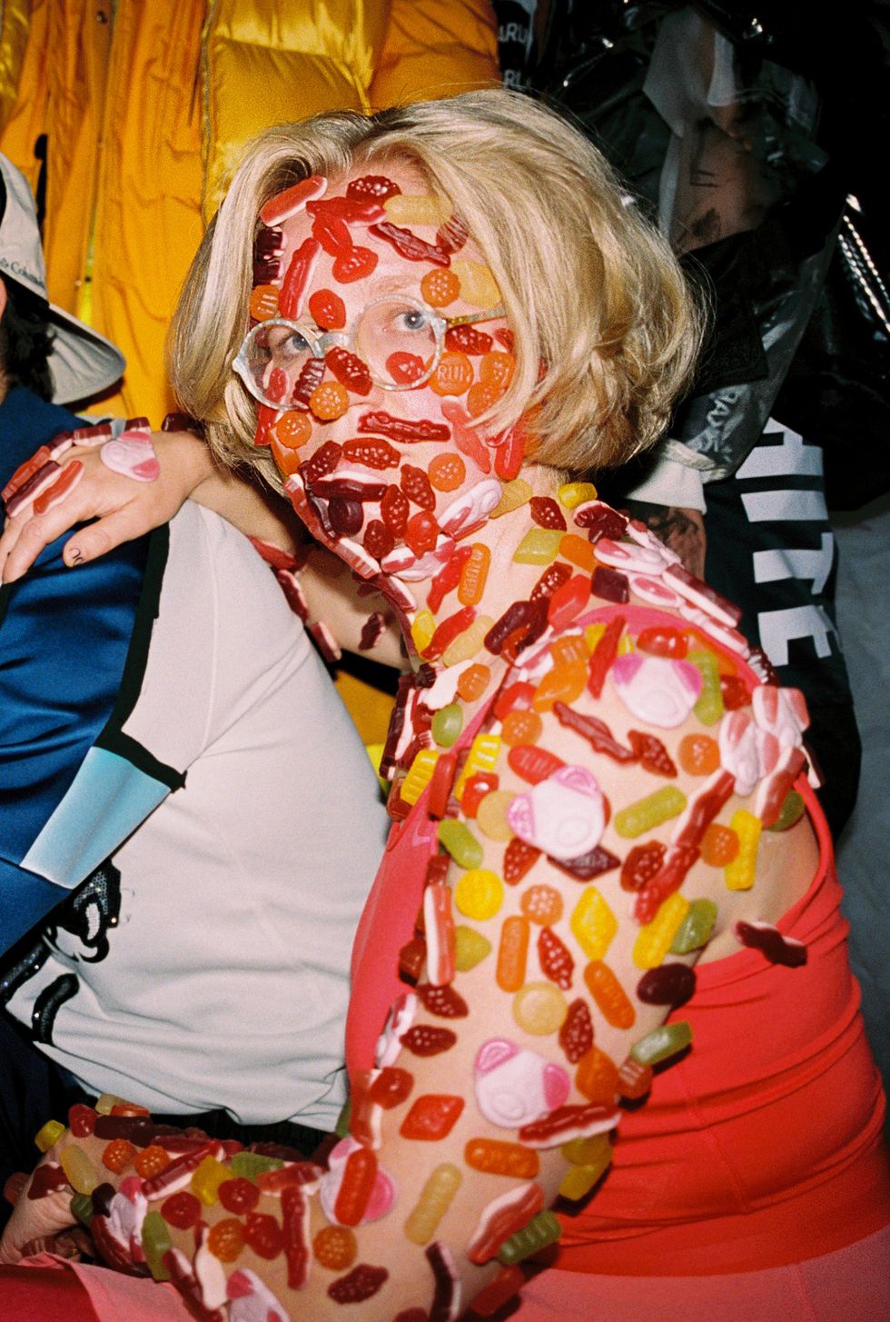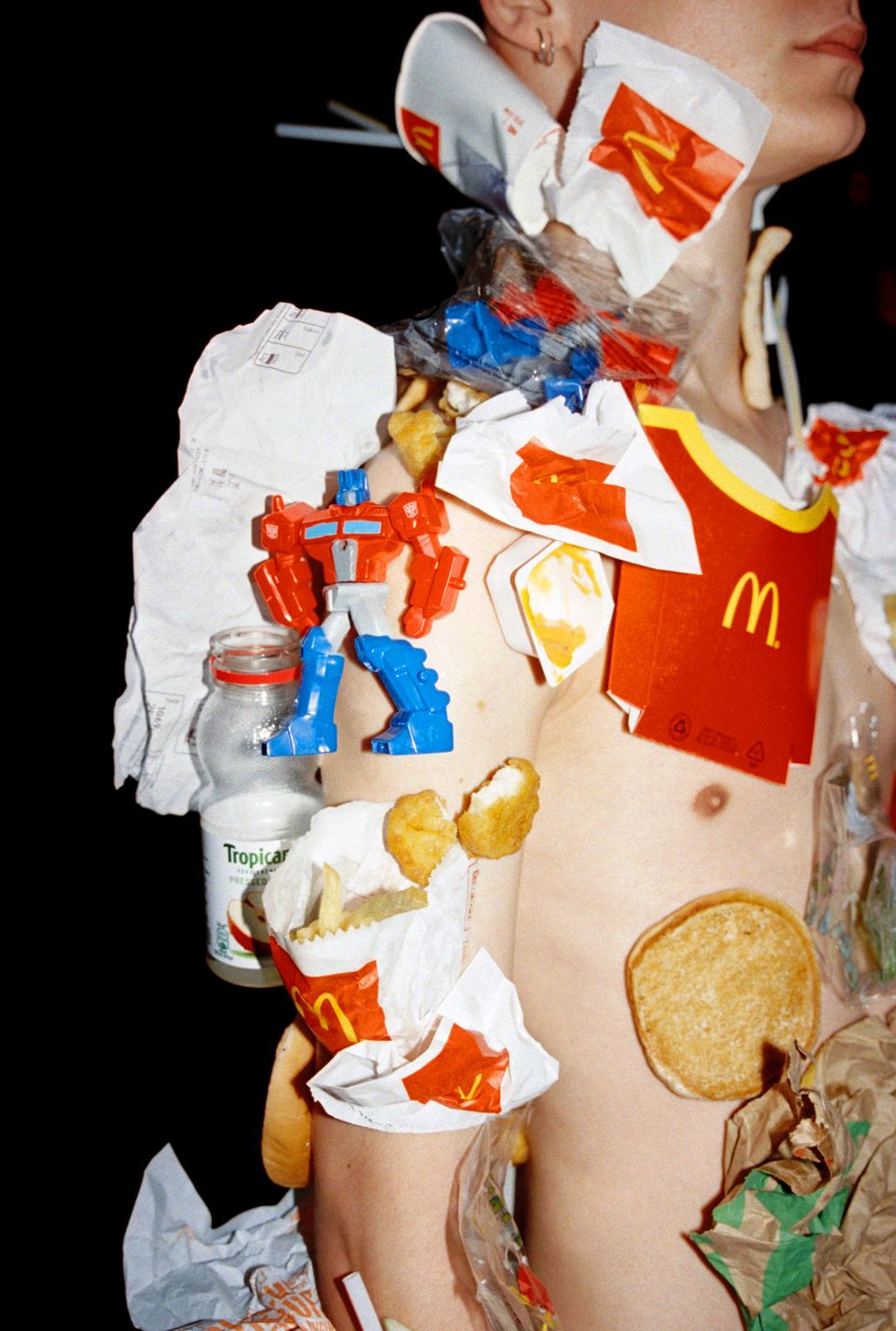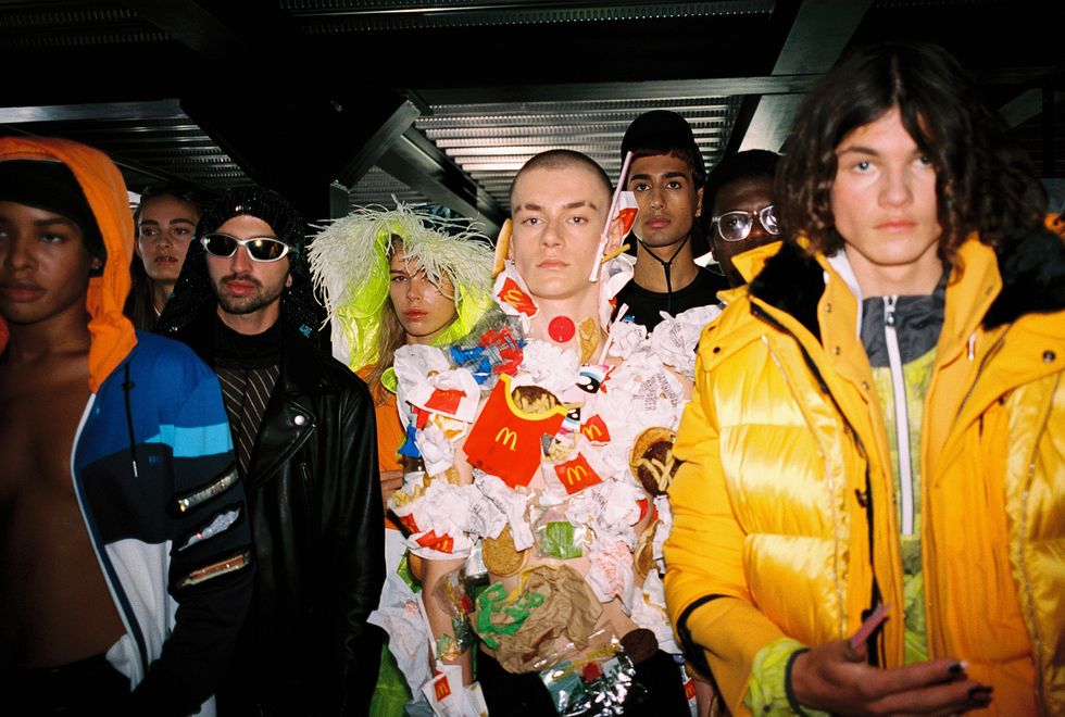 Critiques of consumerism extended beyond fashion and into the food industry, as well. One model appeared with her skin covered completely in gummy candies that matched the colors of her outfit. Another, easily the most clicky look from Lantink's presentation, emerged with his entire upper body concealed in McDonalds — not just the containers and wrapping, but the actual food: fries, patties, hamburger buns, lettuce, and more.