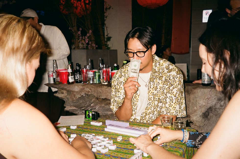 If garden chic is not the vibe, East Never Loses’ monthly ragers invite party-goers into San Gabriel Valley, Los Angeles’ densest Chinese and Taiwanese enclave, for Szechuan food, frosty bottles of Tsingtao, irreverent dancing and four hours of mahjong. From Jianghu, a former dim sum restaurant-turned-club, almost 200 eager mahjong players gather beneath an auspicious red and white glow. A bubble machine emits lemongrass-scented bubbles to repel mosquitos (genius!) from the lime green, baby blue and sparkly pink mahjong sets that decorate the outdoor patio tables. On one side of Jianghu, a line has formed by 9 PM and it comprises attendees who are new to mahjong and waiting to be taught by Lin or one of her teaching assistants. Every now and then, what sounds like twittering sparrows cuts through the excited conversations that fill every corner; this is the song of the noisy, shuffling tiles that signals to people that a new round of mahjong is about to begin.