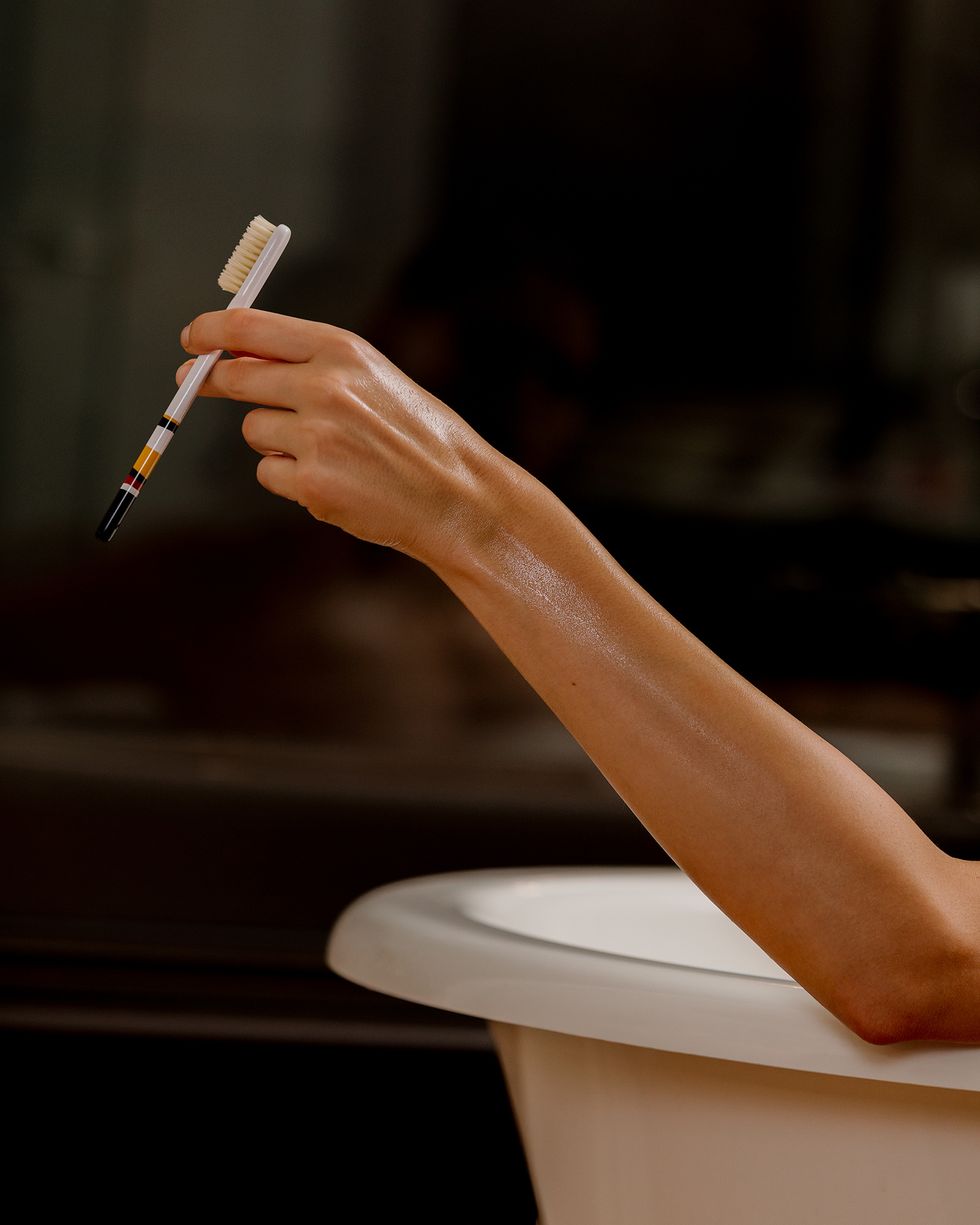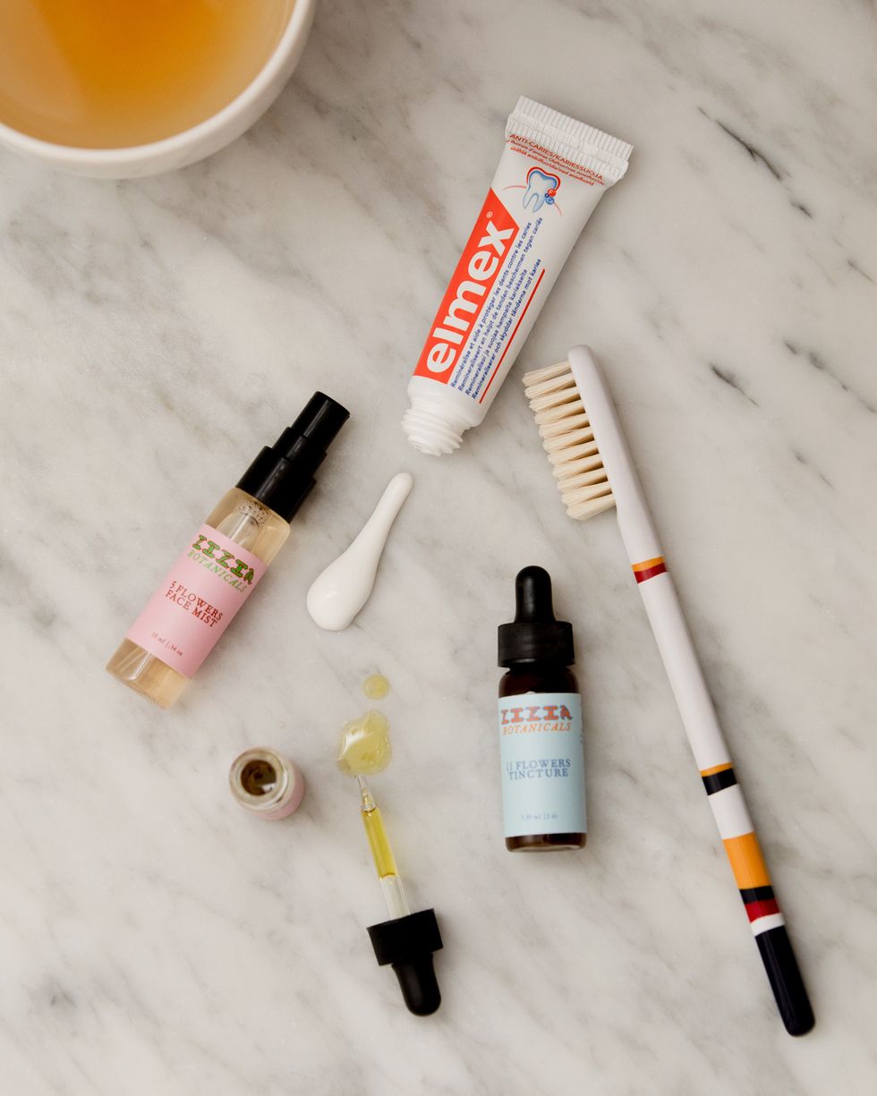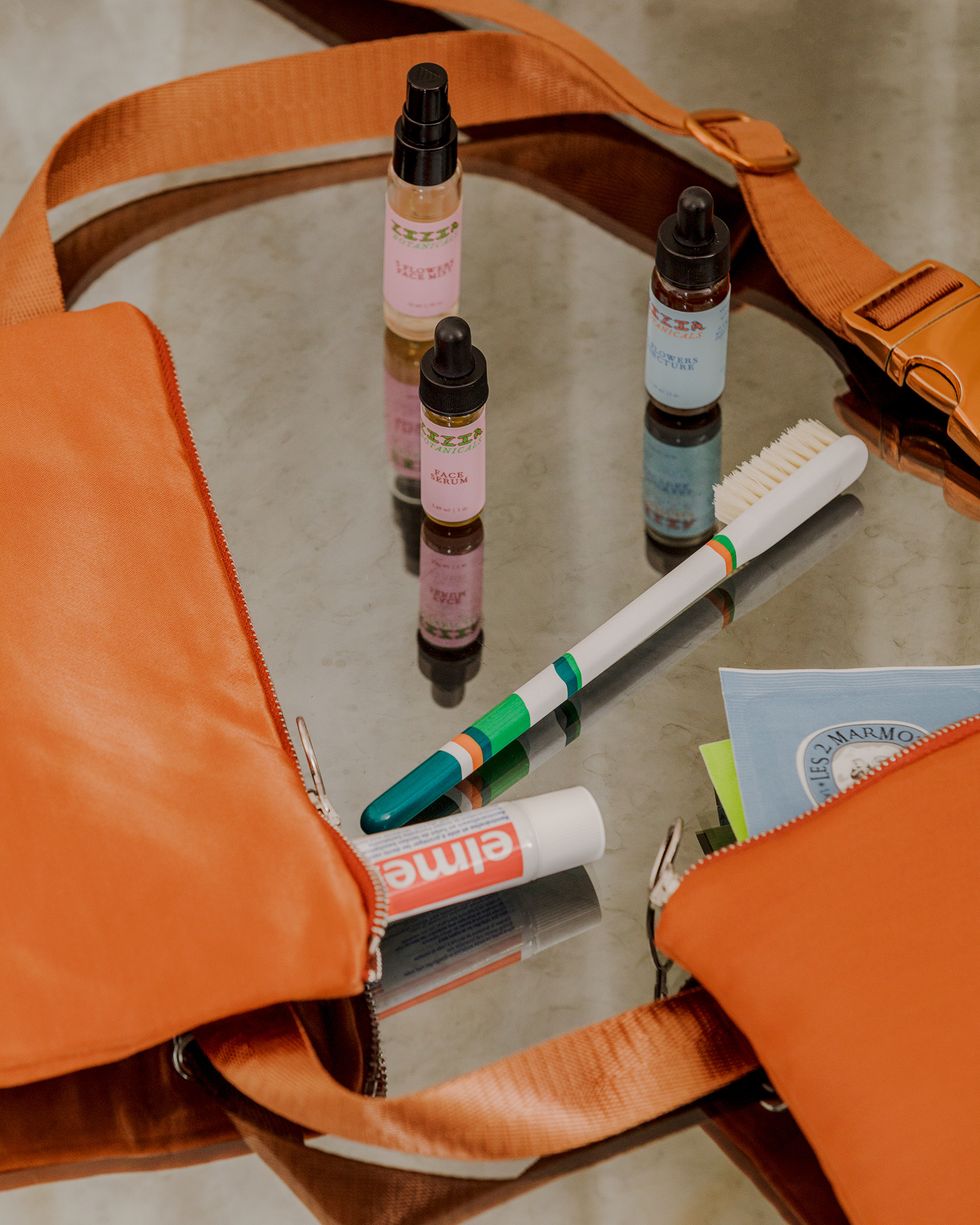 The Travel Kit contains the designers' travel must-haves, including "a satin eye mask, a Zizia Botanicals trio, a Piave natural bristle toothbrush, a travel-sized Elmex toothpaste, and two tea bag infusions imported from France," according to a press release detailing the collaboration.