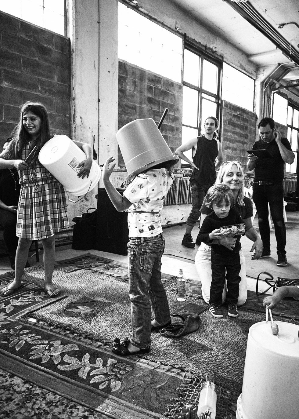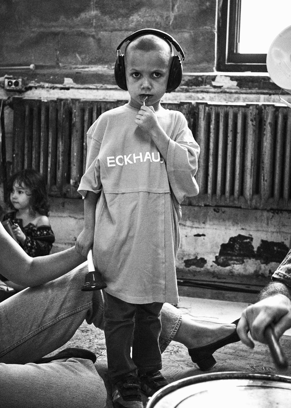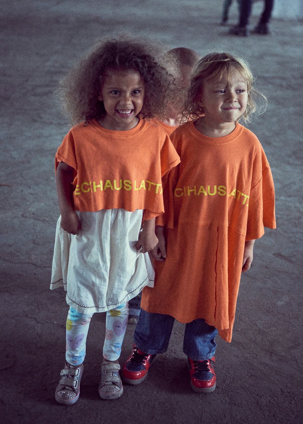 Music was provided by an actual band of children in oversized Eckhaus Latta t-shirts, the "young people orchestra." Lead by artist Brian Chippendale, who kept the beat on a drum, a group of kids played with drums and toy instruments while gathered on a rug by Sophie Stone, which was also included in the designers' recent exhibition at the Whitney.