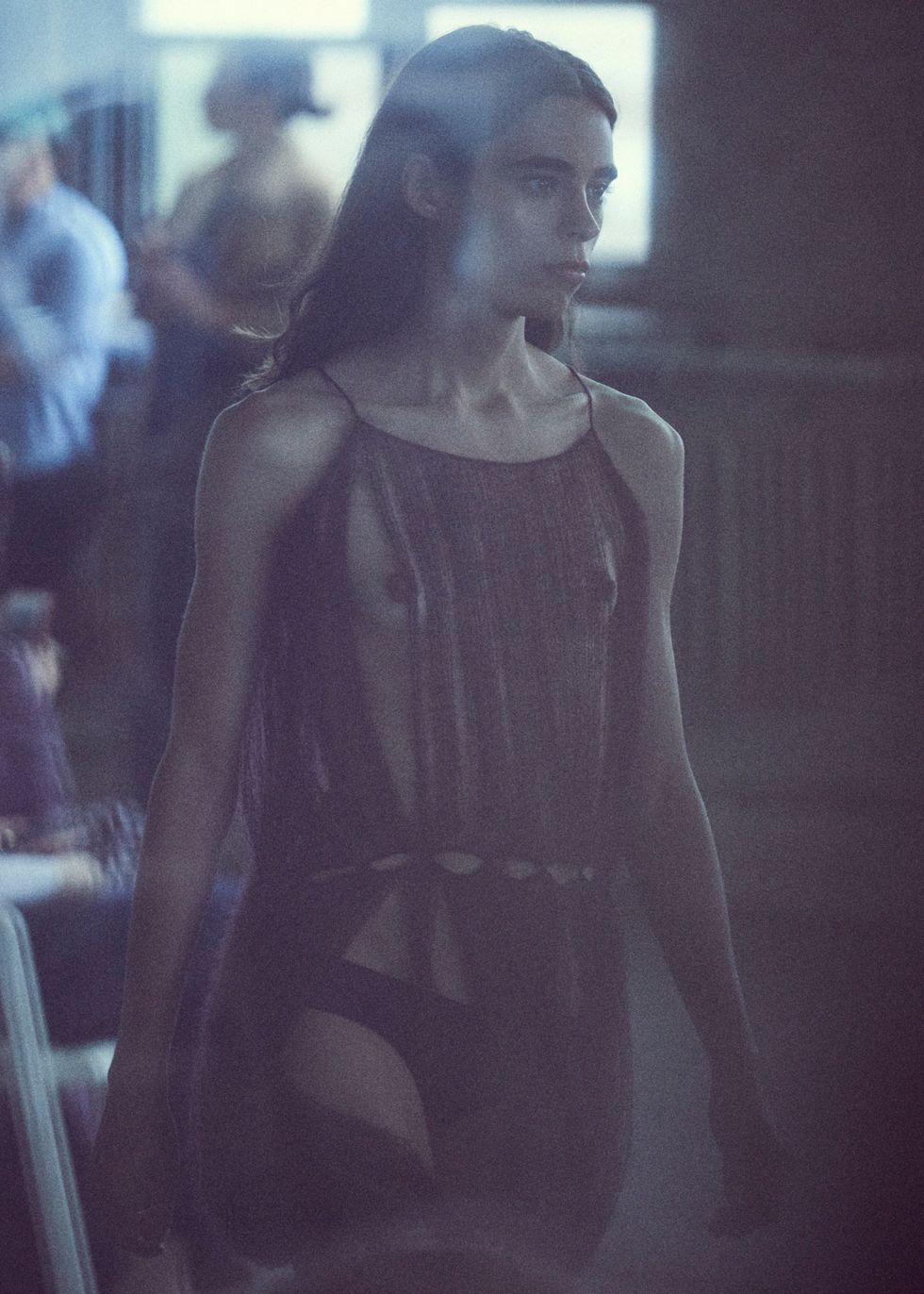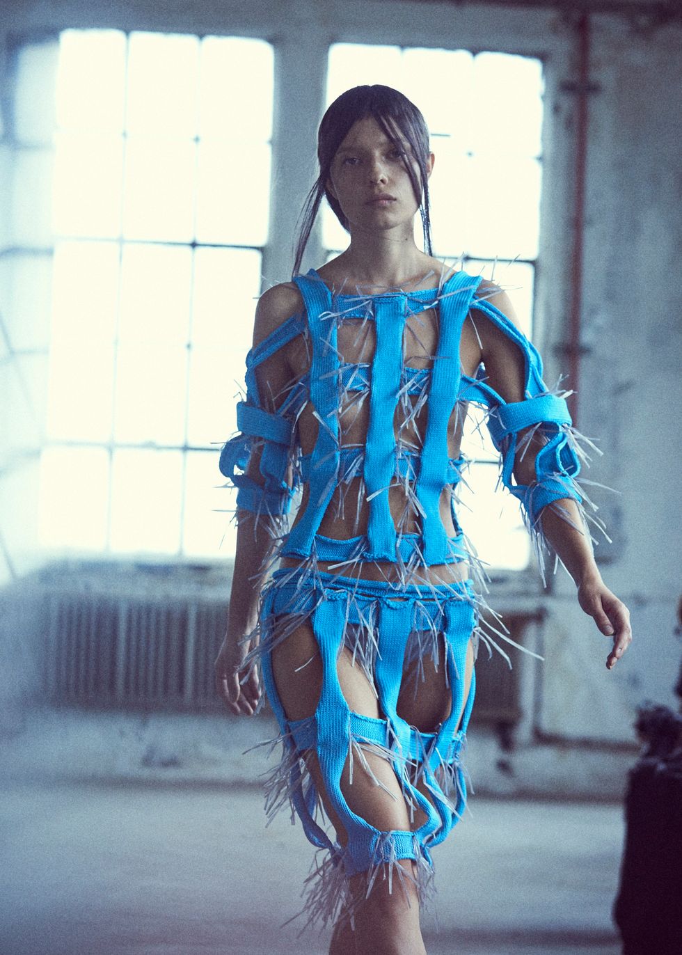One knit blue dress with square cut-outs (it was more cut-out than dress) and spiky plastic ornamentation elicited gasps, as did the two models who walked shirtless, shoulders covered in pieces that lay somewhere between jewelry and sculpture.