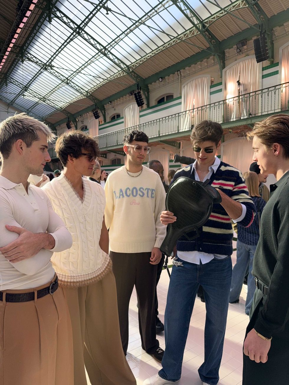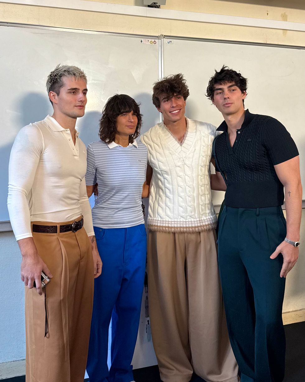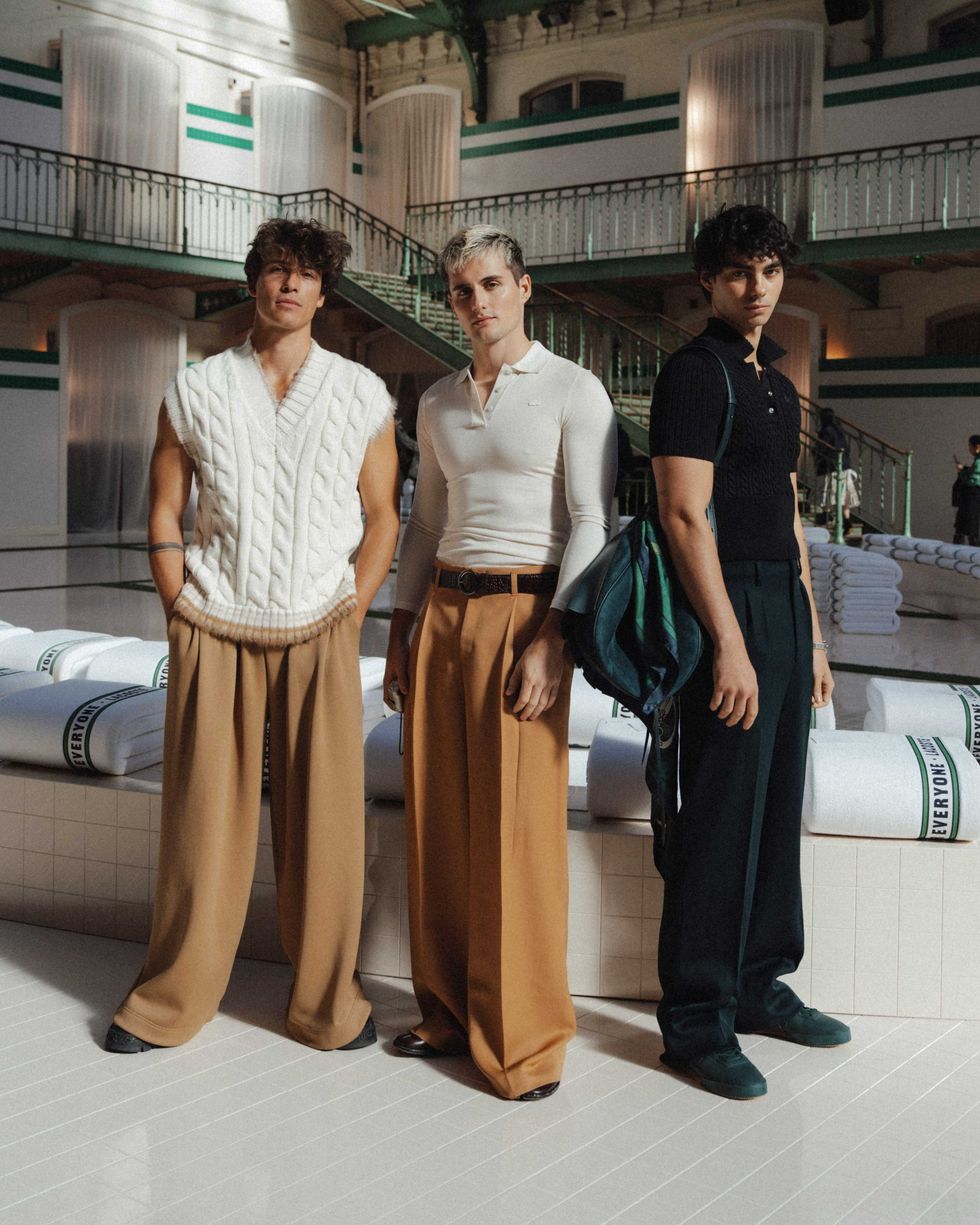 Now, they’re stepping off the phone screen and onto the front row. During Paris Fashion Week, PAPER joined the Elevator Boys at Lacoste, where the group brought their signature coordinated cool to the brand’s effortlessly preppy universe. Inside the historic venue, stacks of crisp white towels lined the runway — because (of course) only Lacoste could turn tennis whites into seating. The Boys fit right in: tailored knits, retro polos, and wide-leg trousers, all styled with that distinctly European sense of ease.