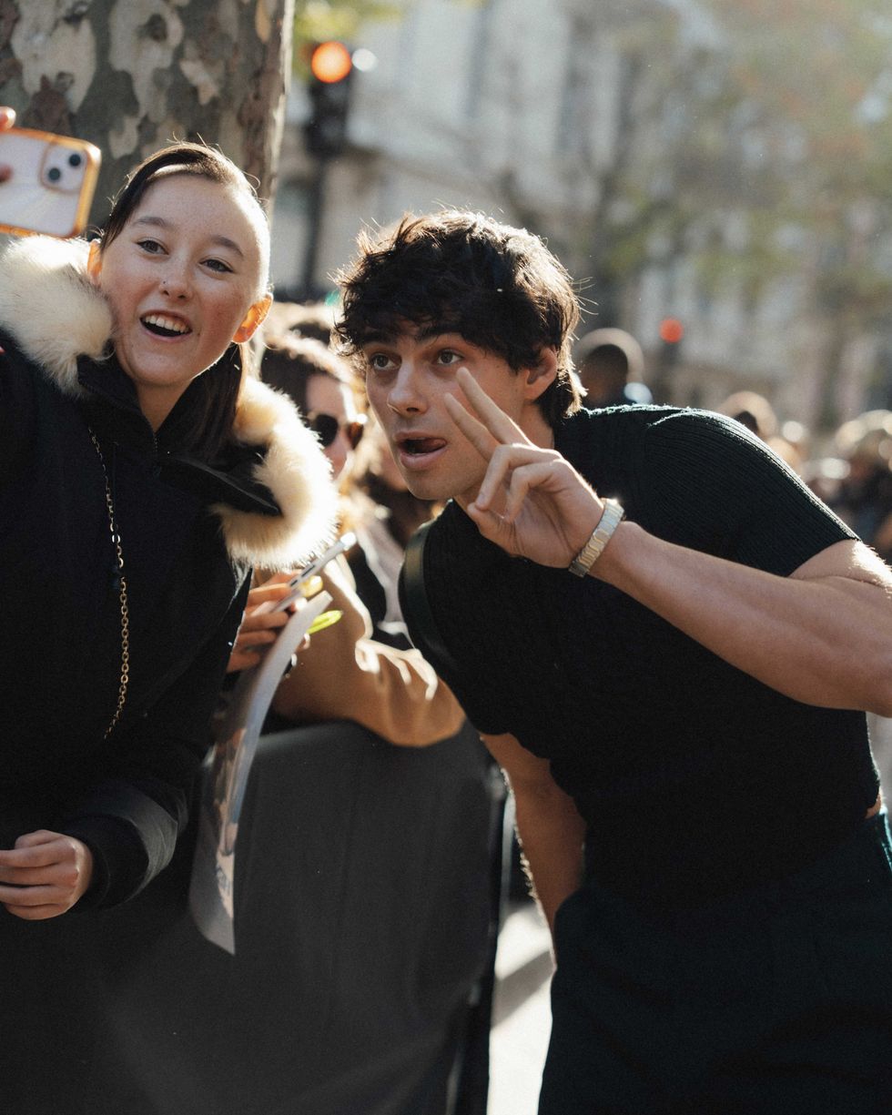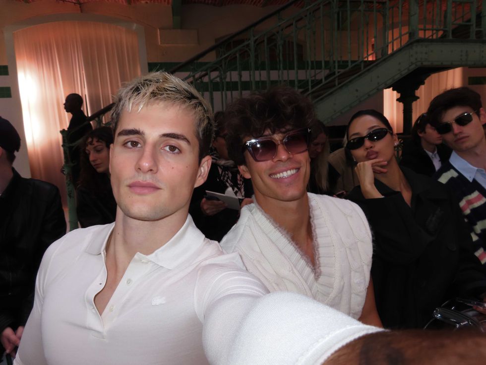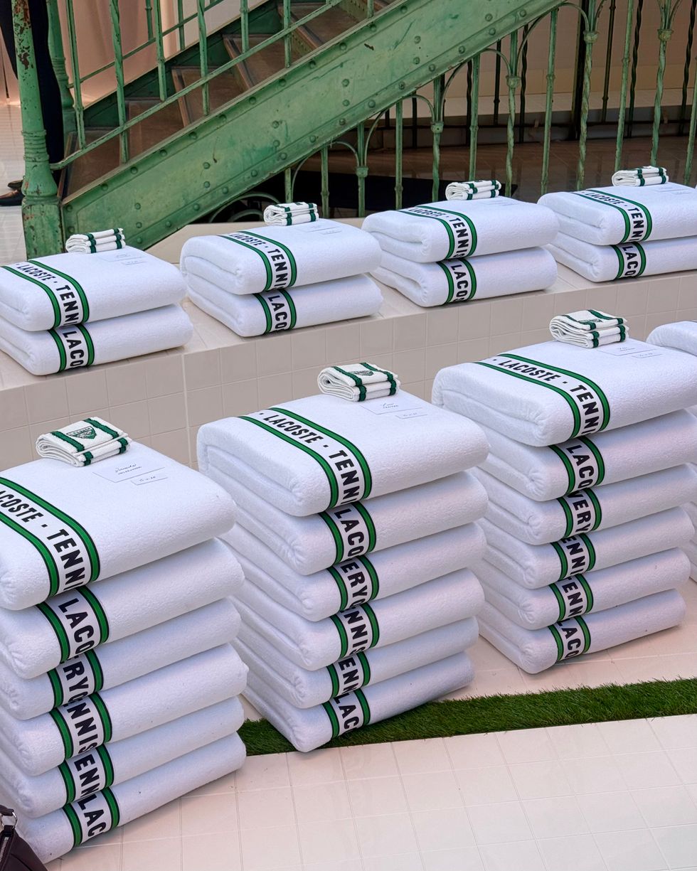 Now, they’re stepping off the phone screen and onto the front row. During Paris Fashion Week, PAPER joined the Elevator Boys at Lacoste, where the group brought their signature coordinated cool to the brand’s effortlessly preppy universe. Inside the historic venue, stacks of crisp white towels lined the runway — because (of course) only Lacoste could turn tennis whites into seating. The Boys fit right in: tailored knits, retro polos, and wide-leg trousers, all styled with that distinctly European sense of ease.
