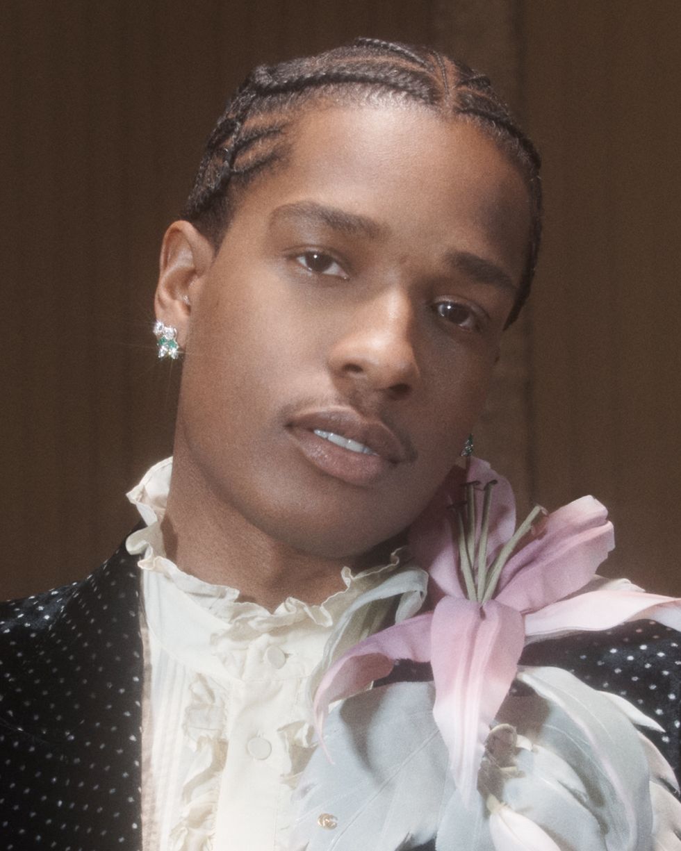 Page wears a palm collared shirt while Garner dons light blue fur and Rocky sports a frilly top with a polka-dot blazer with floral embroideries. See more portraits from the Gucci Guilty campaign, below.