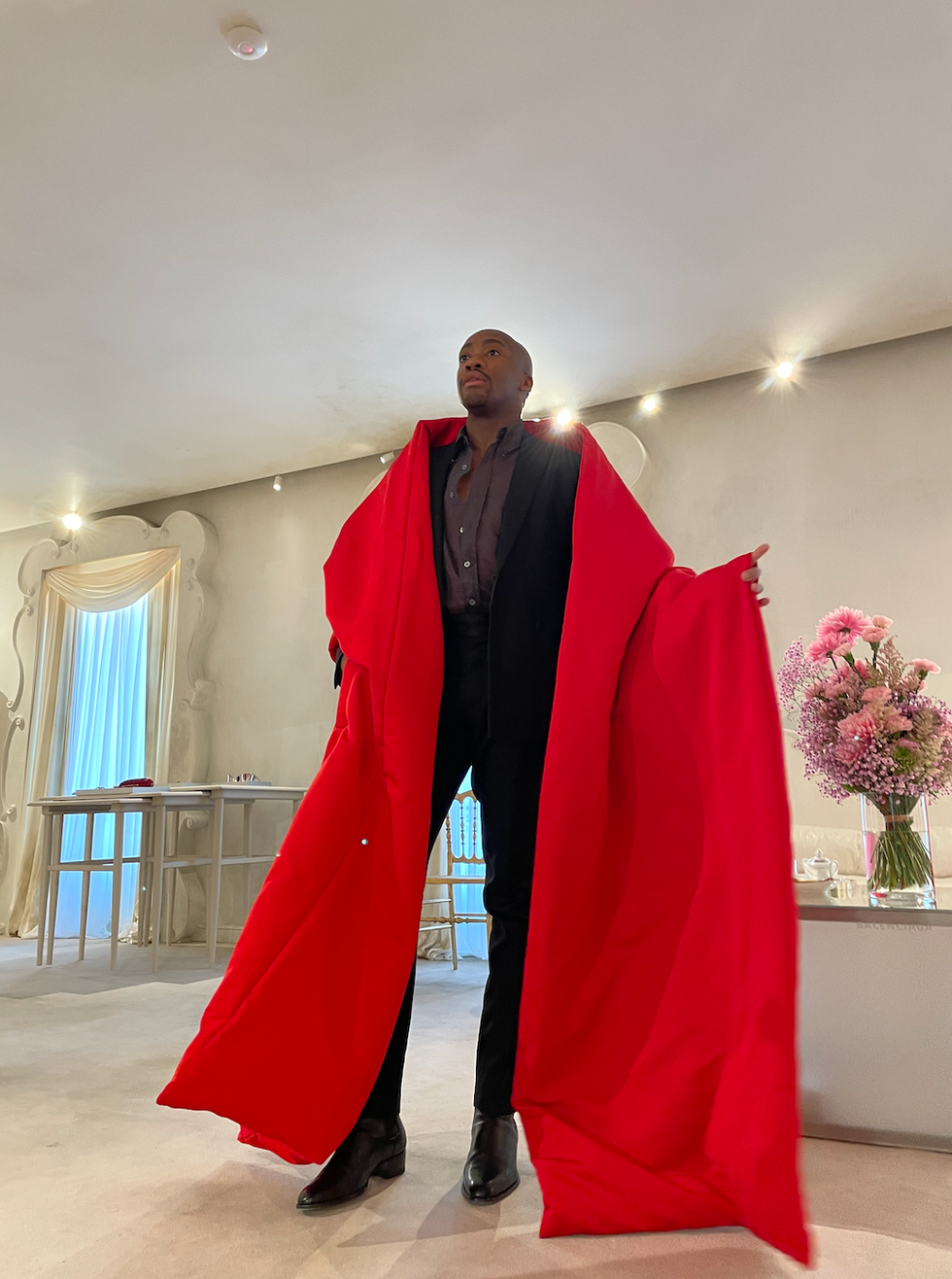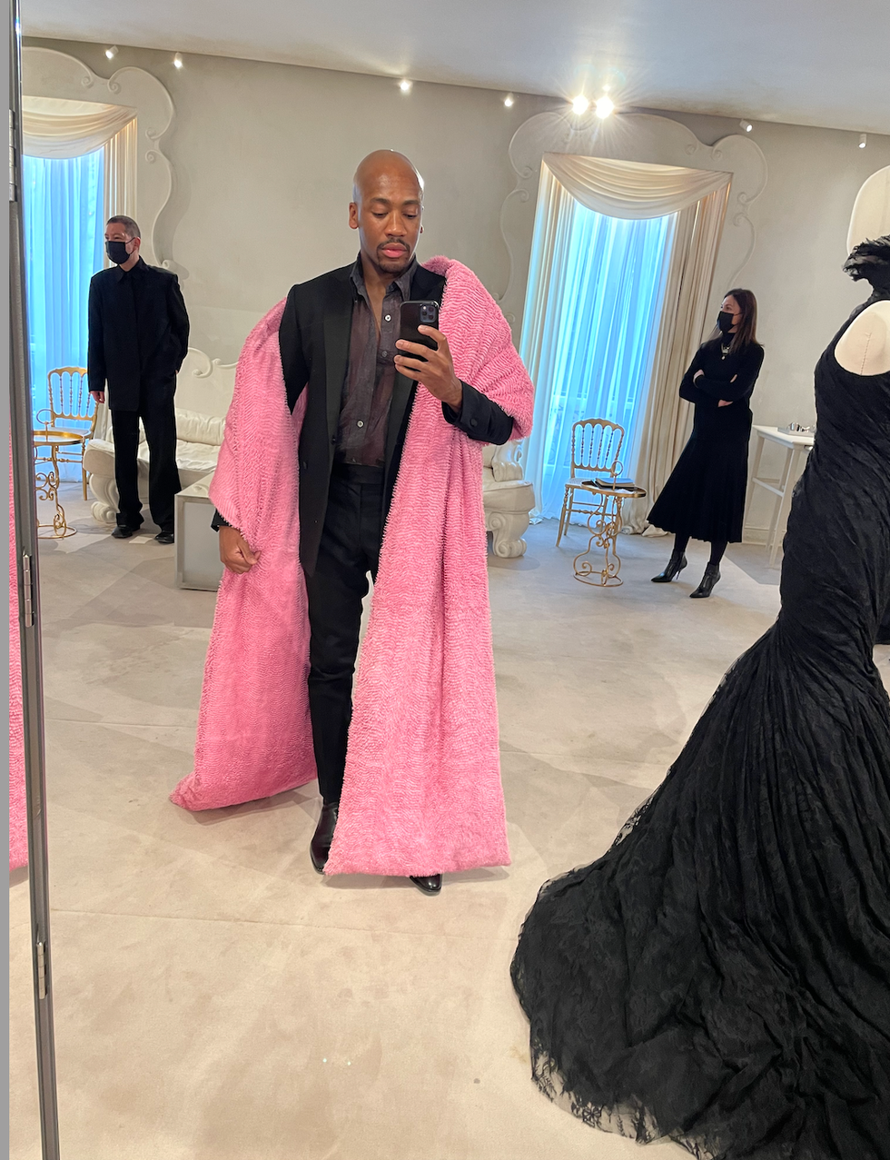 I was invited to the Balenciaga couture salon during my time at Paris Men's Fashion week. It was my biggest appointment that day , the team was so kind to clear the entire salon for me and present each look from their couture collection. I was very honored to be there, the team had already been notified that we landed the cover of PAPER. They presented some of their most amazing options. The moment I tried on the red stole everyone in the salon said, "Wow this is the cover !" It felt and looked so regal I immediately thought that if I could get this piece shipped in time I could create a look honoring the late Andre Leon Talley.