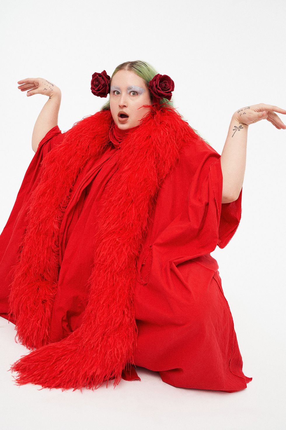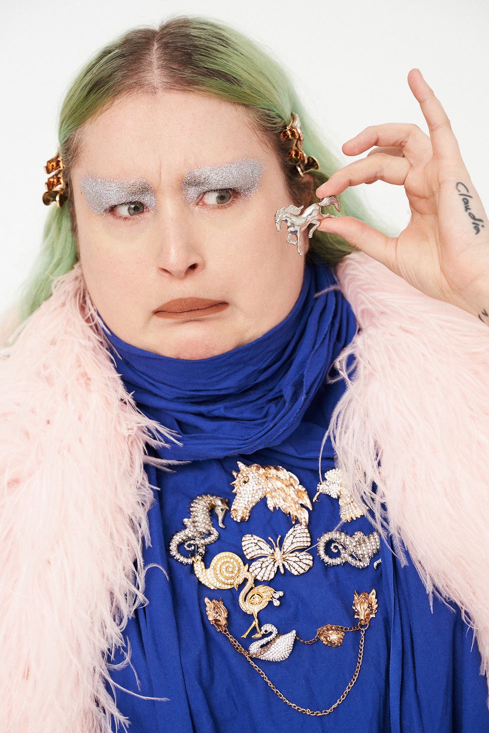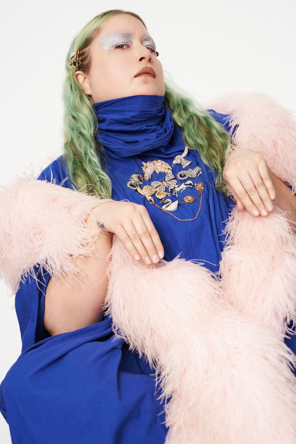 The doorbell rings, and before I can get the door, Emilia Fart has already let herself in. Sporting her signature robe (this one's emerald green with a cluster of silver brooches adorning the front), neck scarf and feather boa beneath a faux fur jacket, Emilia skips the standard Montreal double-cheek kiss and greets me with a hug. A fitting entrance for this Canadian YouTube star whose loyal following has been built upon a simple yet seemingly impossible concept for many of us: giving yourself permission to take up space.