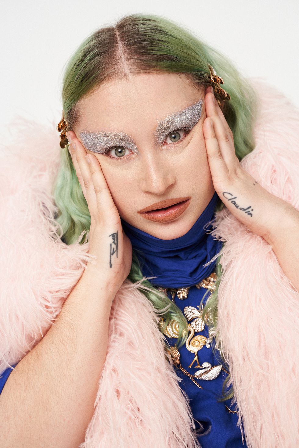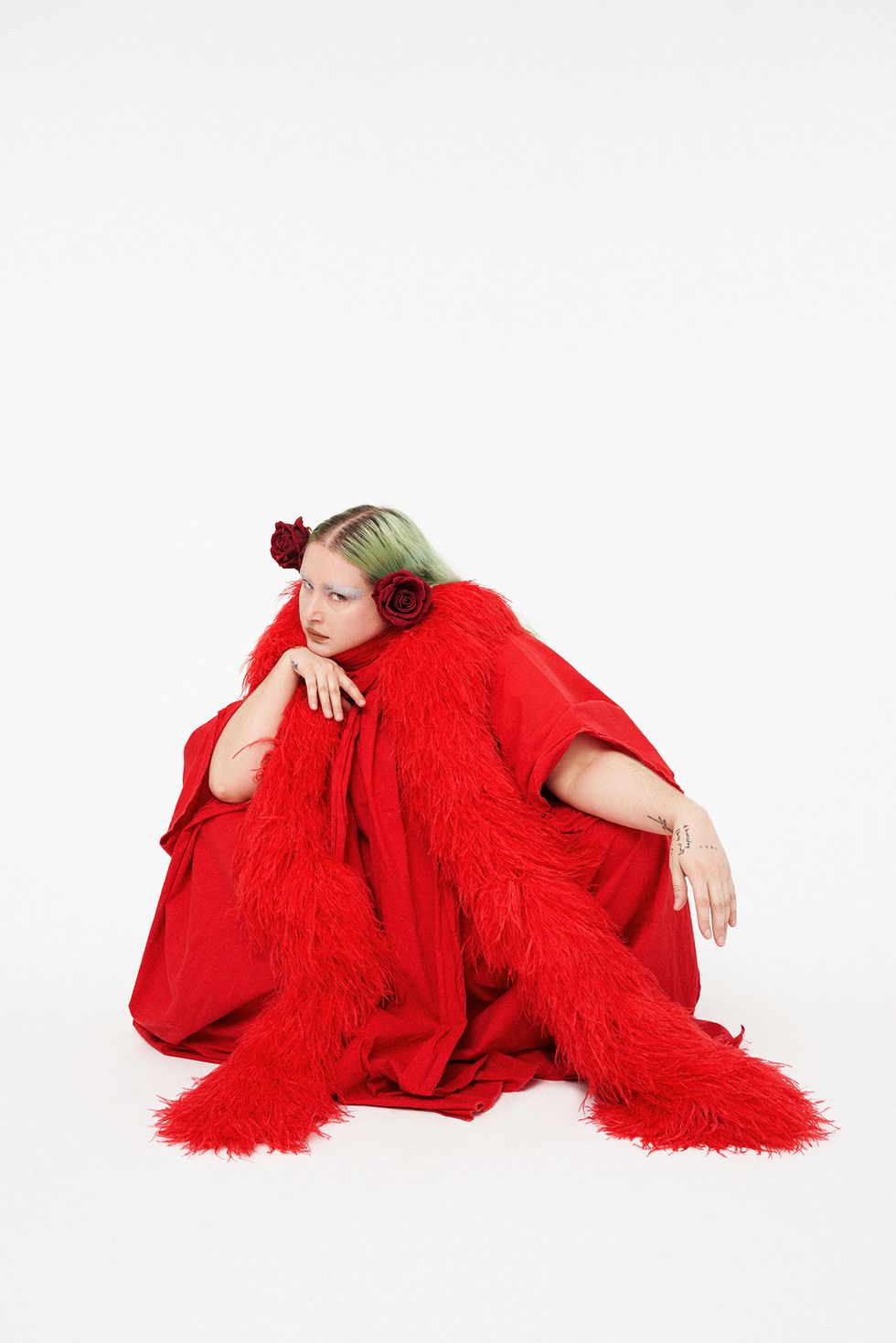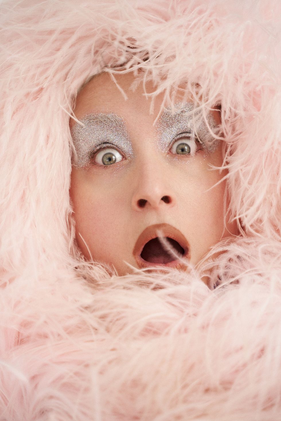 The doorbell rings, and before I can get the door, Emilia Fart has already let herself in. Sporting her signature robe (this one's emerald green with a cluster of silver brooches adorning the front), neck scarf and feather boa beneath a faux fur jacket, Emilia skips the standard Montreal double-cheek kiss and greets me with a hug. A fitting entrance for this Canadian YouTube star whose loyal following has been built upon a simple yet seemingly impossible concept for many of us: giving yourself permission to take up space.