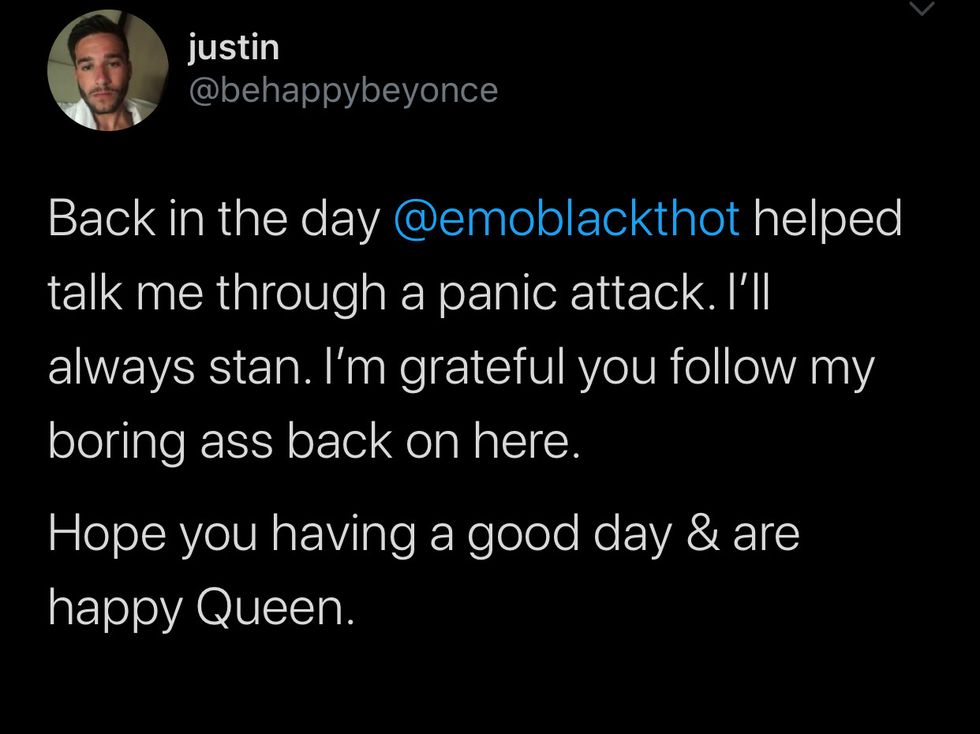 In the wake of all this, Hickland began to rebuild via the @EmoBlackThot account — though it was no easy feat, especially as someone still reeling from two separate experiences that not only threatened his online persona, but his physical safety. Yet, Hickland still felt a need to support his followers and connect with the online community that had been with him from the beginning.