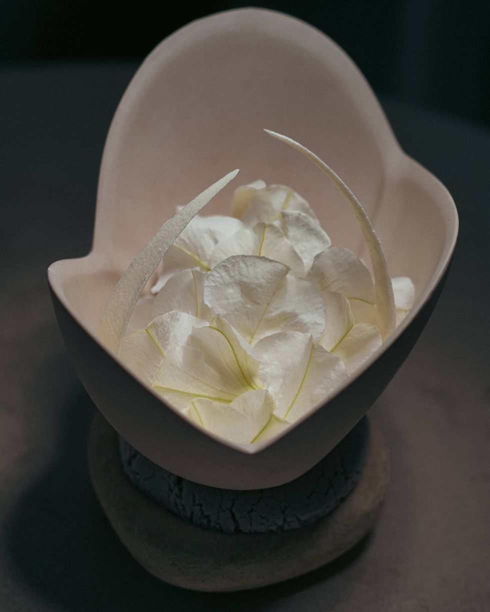 Kahn aborda la gastronomía desde un lugar de profunda curiosidad, fusionando una capacidad creativa excepcional con una filosofía que venera la naturaleza y eleva la mesa a un espacio casi sagrado de comunidad. Sus platos trascienden la forma tradicional, adoptando a menudo cualidades escultóricas que dialogan con la arquitectura que los alberga y se despliegan entre composiciones florales.