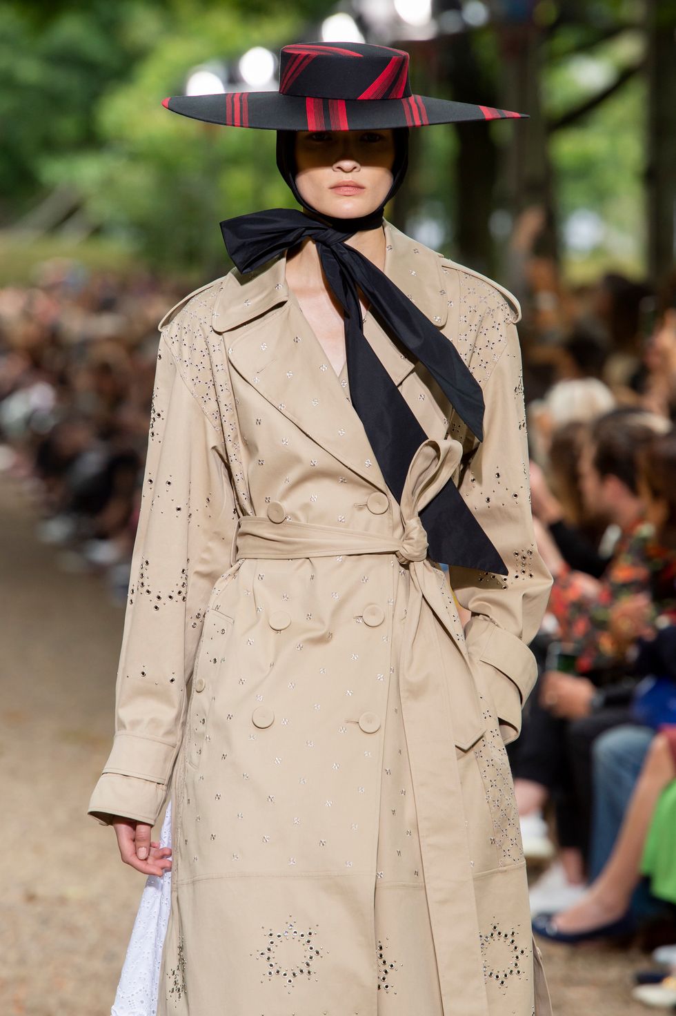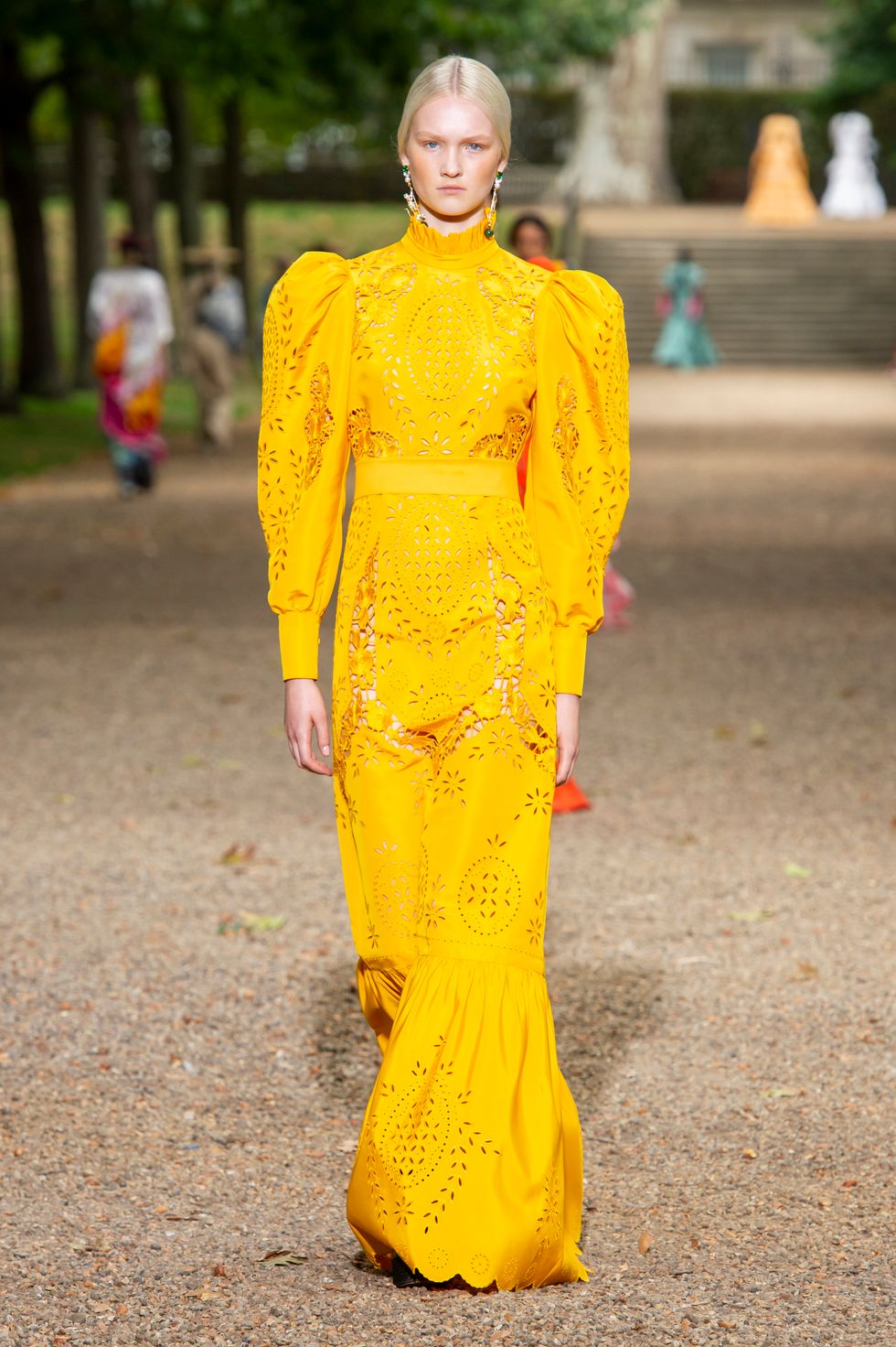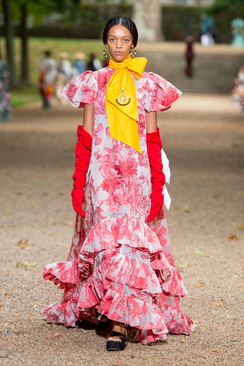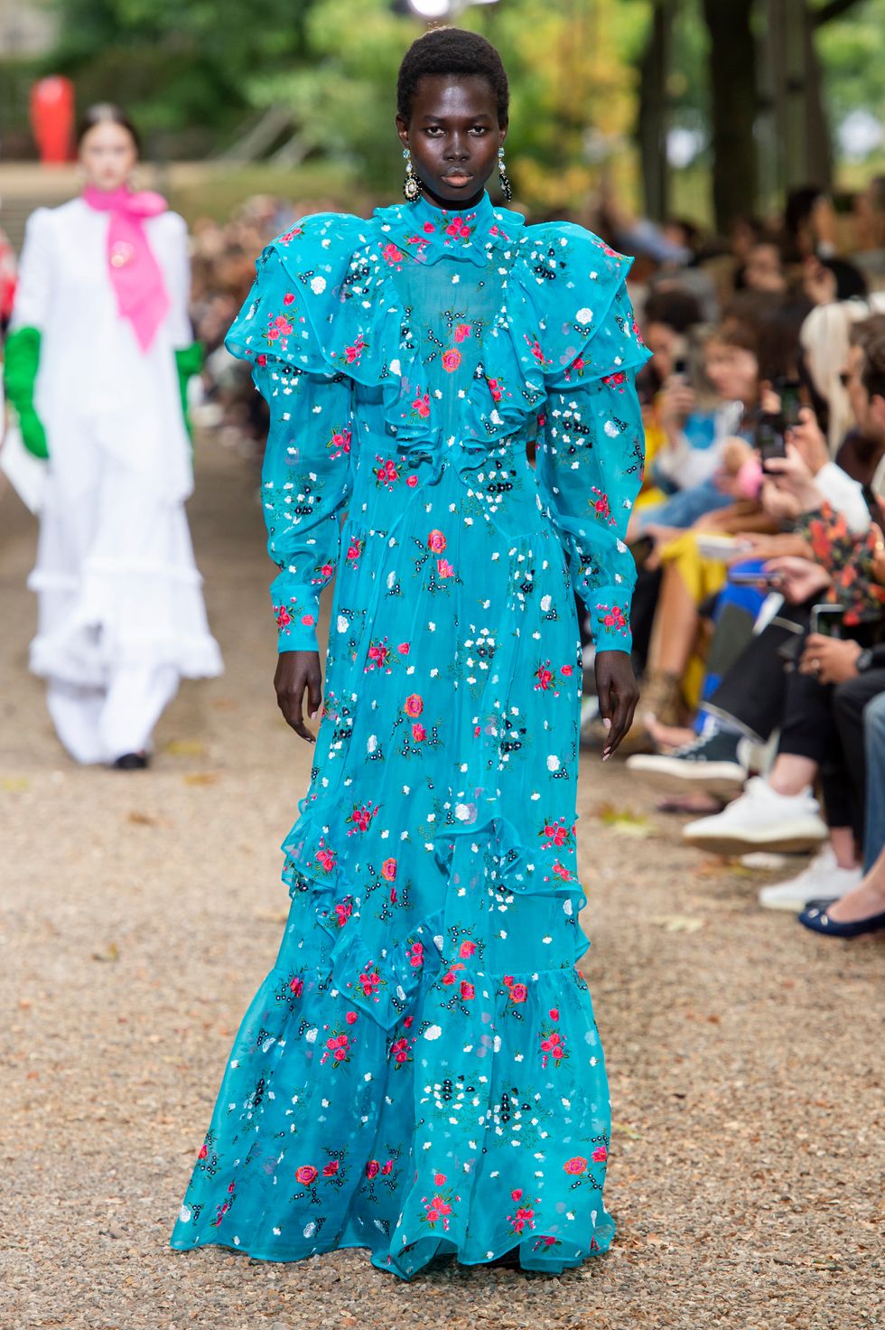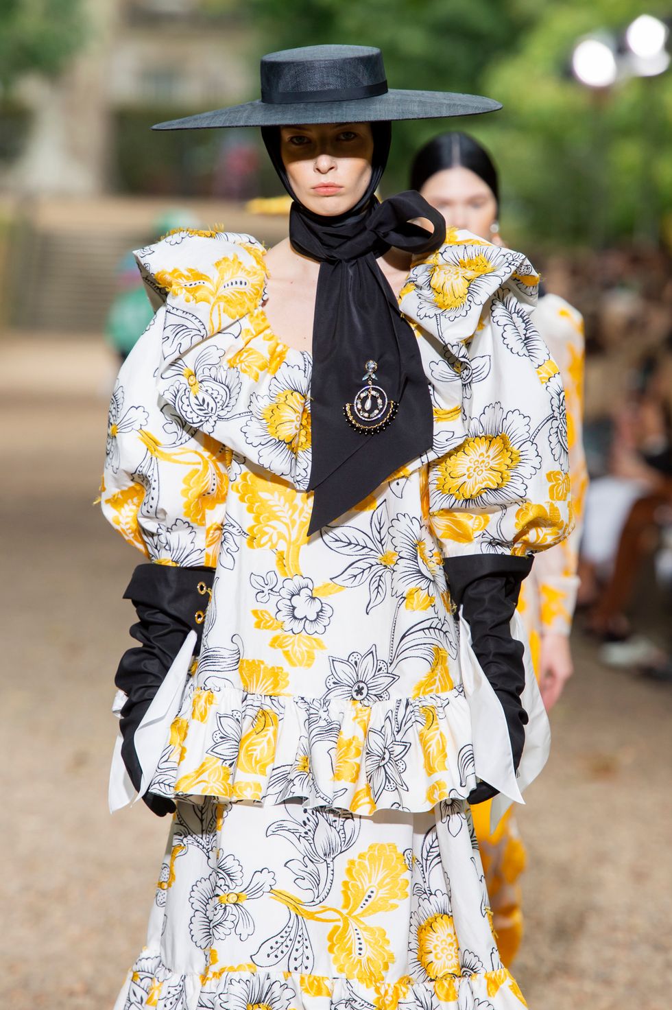 Erdem Moralioglu, known for his romantic, modest frocks and Victorian-inspired references, took the crowd to an outdoor setting on a tree-lined square in London for his Spring 2020 showing. While the Canadian/Turkish designer isn't particularly known for making sexy dresses, this season got rid of virtually all sexy design cues and removed any waist definition while completely covering the body from head-to-toe. Instead, his women for spring are regal, worldly, and unabashedly confident in their ethereal, statement looks. Here's everything else you need to know about the collection.