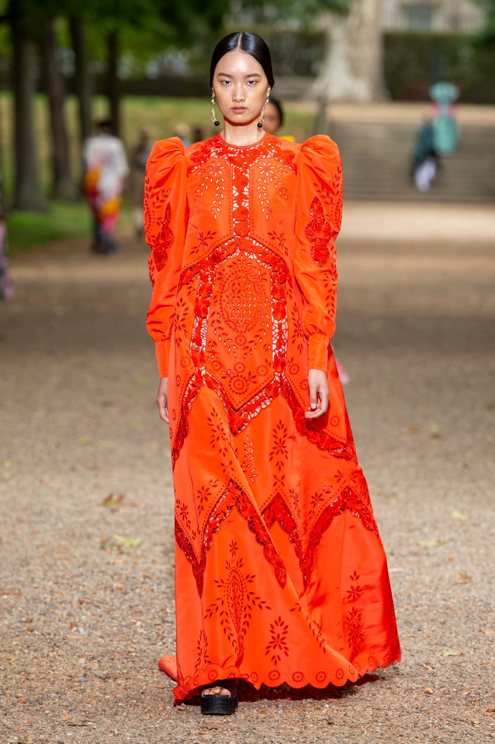 Elbow-length gloves adorn the arms of Erdem's Victorian era-inspired ladies, including bright red and green numbers.