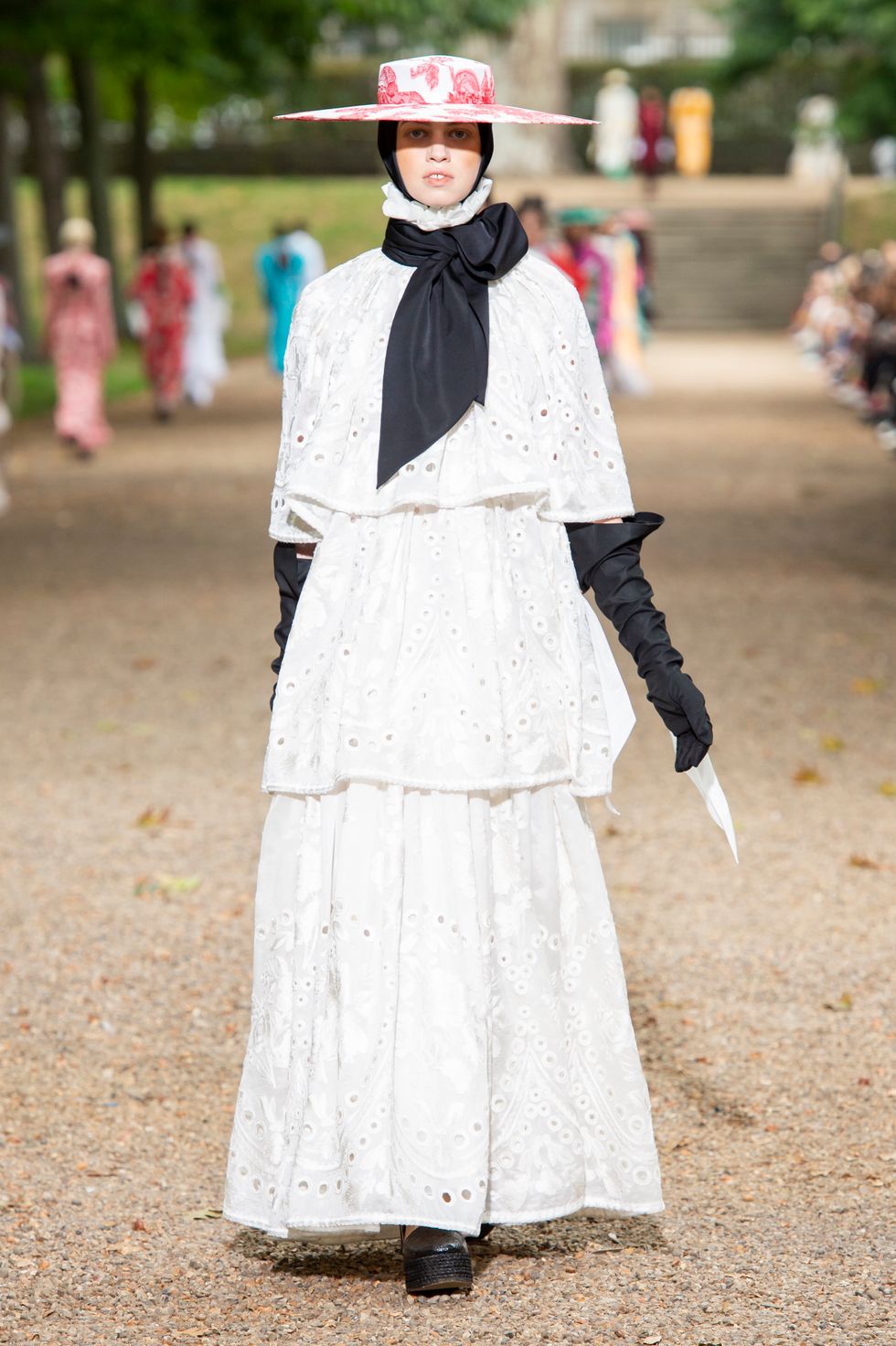 Dresses with three or more tiers of white broderie anglaise, chiffon, and brocade fabrics all conjured a 19th century vibe.
