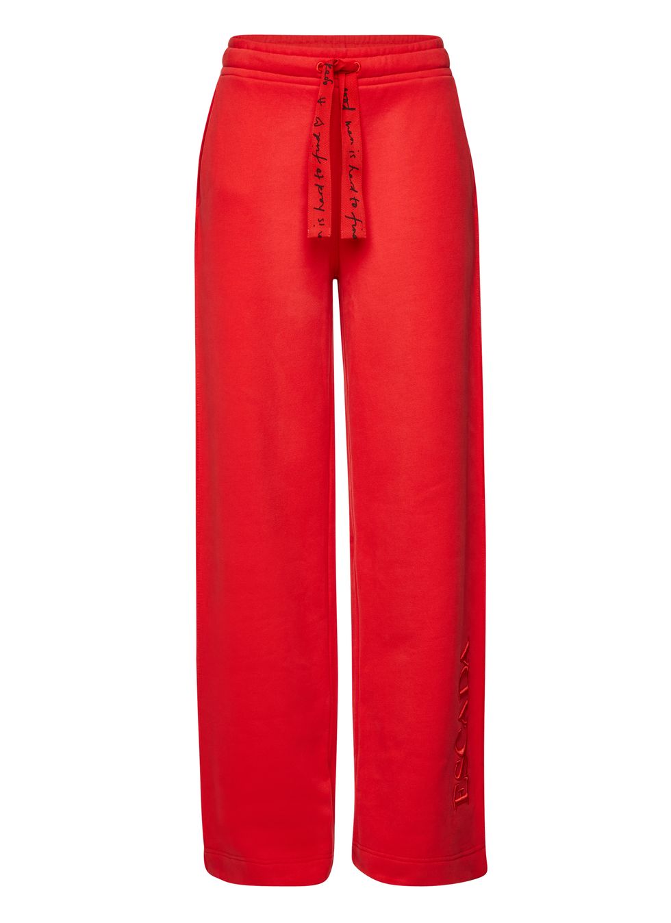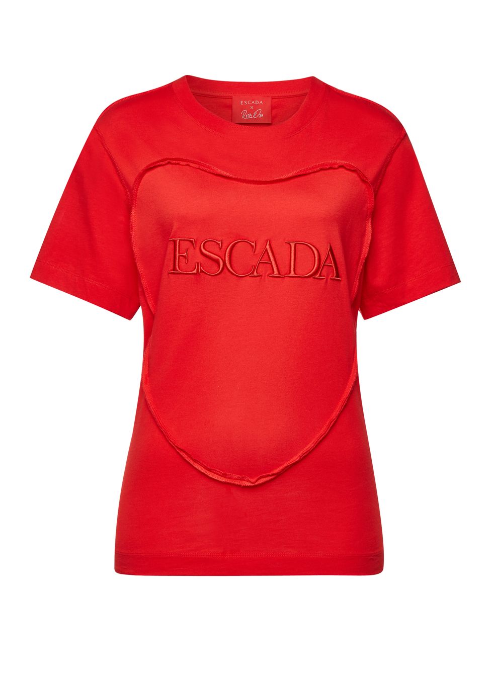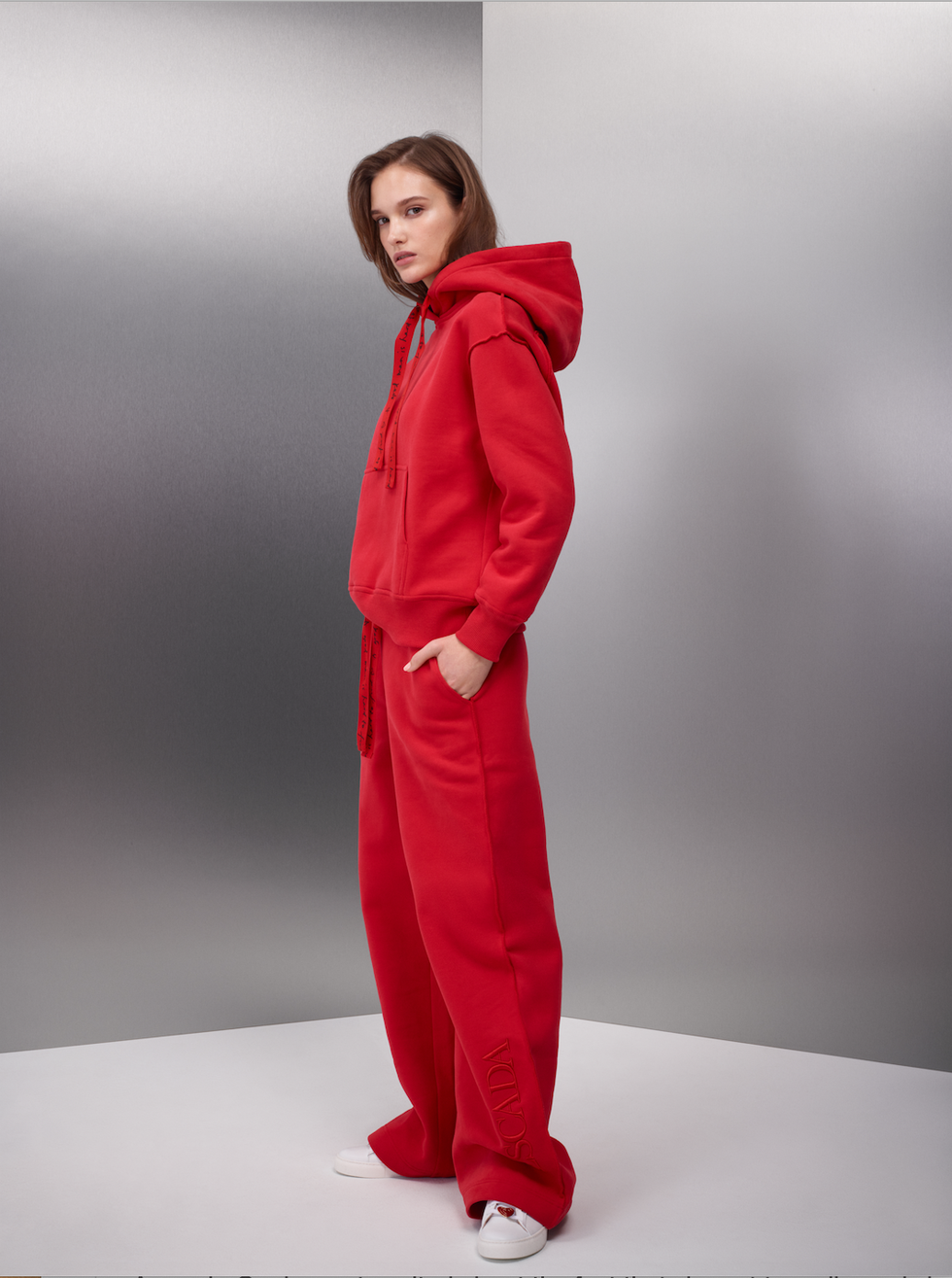 To that end, each look she designed is rendered in a bright shade of red, which Ora says is not only her favorite color but also Escada's trademark hue from back when it started, when it was all about power and strength. Ora, who describes herself as a "tomboy at heart," was able to inject her own personal style and tastes to the collection. A casual track suit look and a hoodie attached to a winter cloak are just some of the ways she experimented with streetwear.