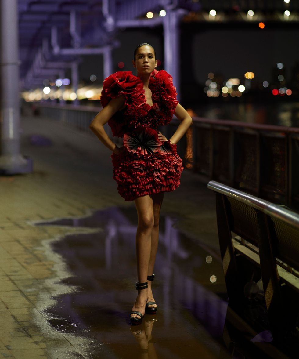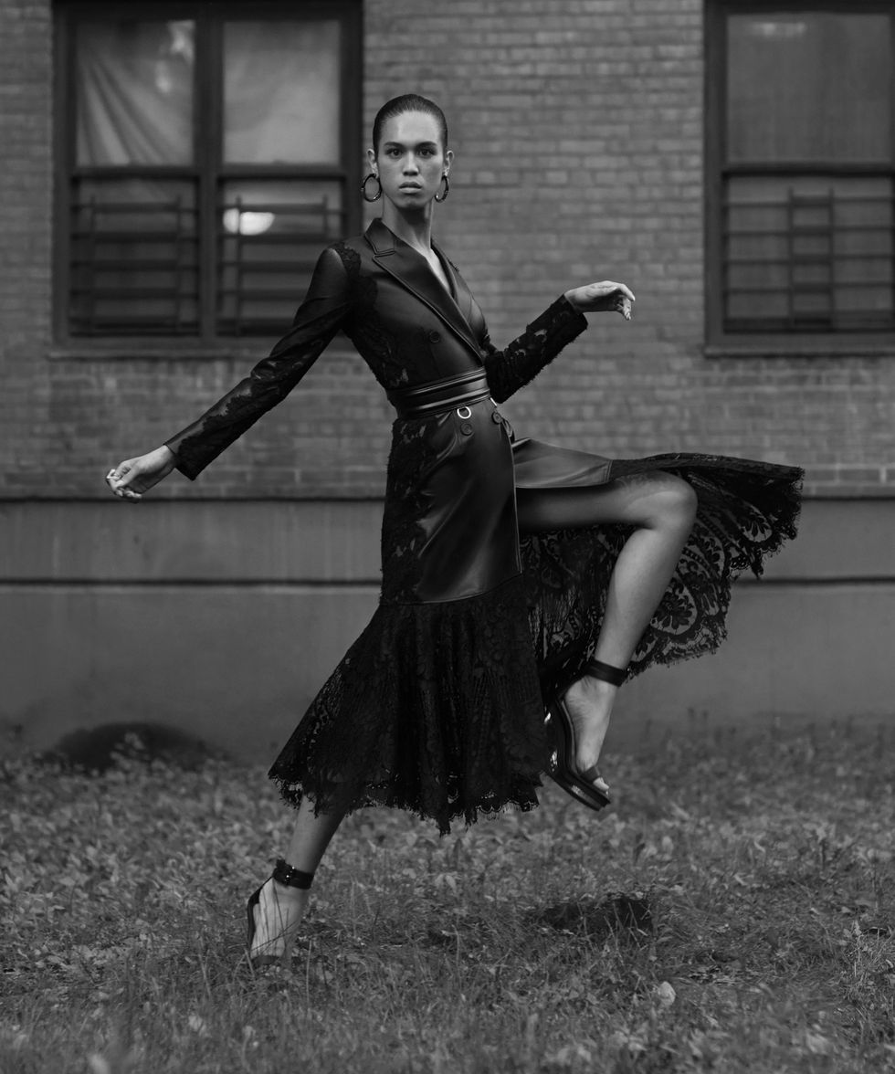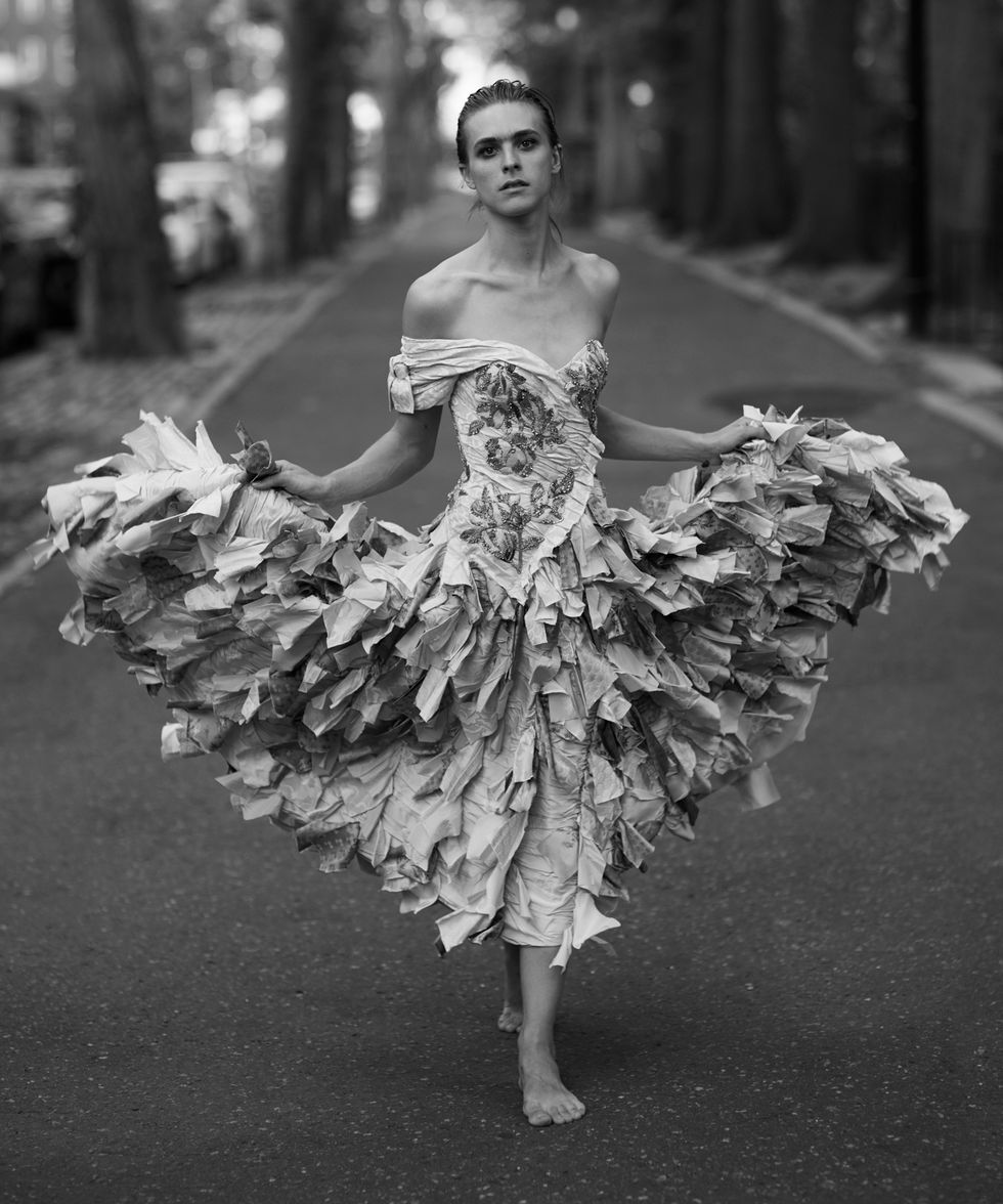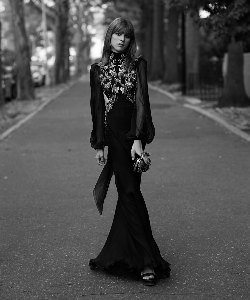 The photos capture the designs by Creative Director Sarah Burton, who this season played with contrasts of sharp tailoring and floral silhouettes. Speaking of contrasts, the models pose against a variety of backdrops including tree-lined roads and under industrial bridges. (Green's signature black and white aesthetic is featured throughout.)