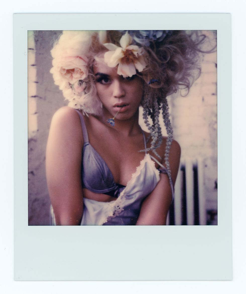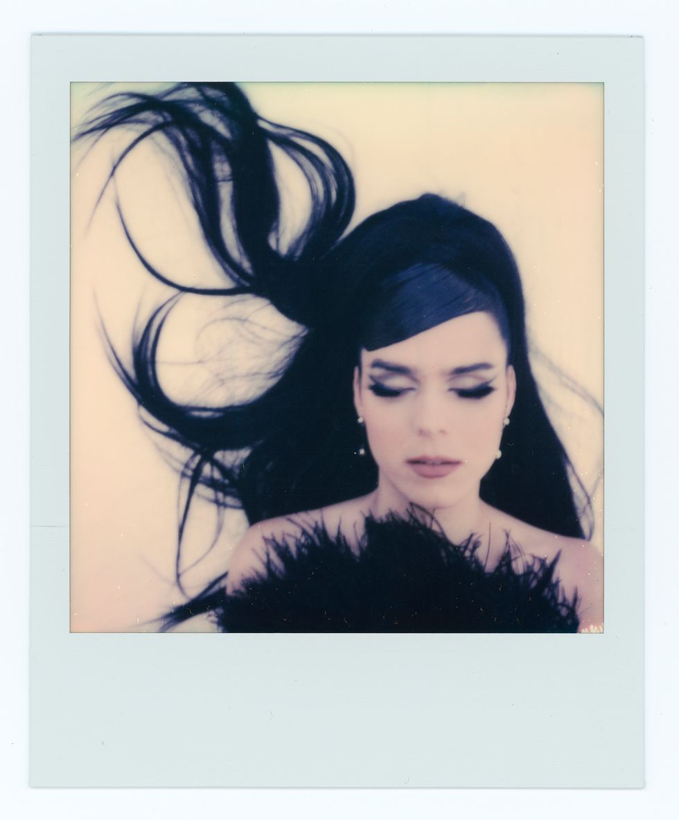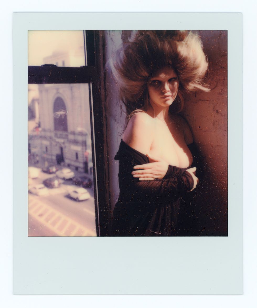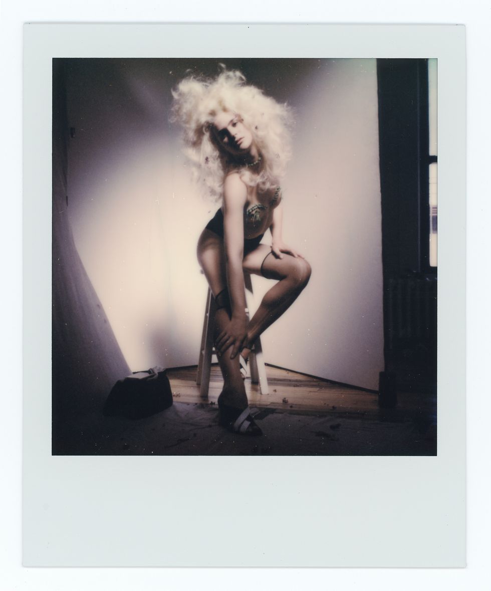 Green’s style runs the gamut from hazy, frenetic polaroids to crisp black-and-white portraiture, resembling, by turns, cult photographers like Joyce Baronio and the ecstatic glee of early Richard Avedon. Avedon loved and identified with his models deeply, but through a scrim of professionalism and gentlemanly distance. Green has no such tension. The relation between himself and his subjects is 1:1, with photographer and sitter both clearly egging each other on. His own experience as a male model is no doubt a major engine and source of empathy. With each shoot, Green takes his typical studio set-up and allows his ladies to chew it up and spit it back out. Simple compositions are blurred into fist-fight clouds of hairspray, falsies and rivers of inky black mascara. The view from Green’s Chinatown studio is timeless New York: all exposed red brick and questionably sound fire escapes. Taken together with their mock ’60s styling, his models look like they’ve escaped from a lost Warhol film — down-and-out socialites on an extended glamour bender.