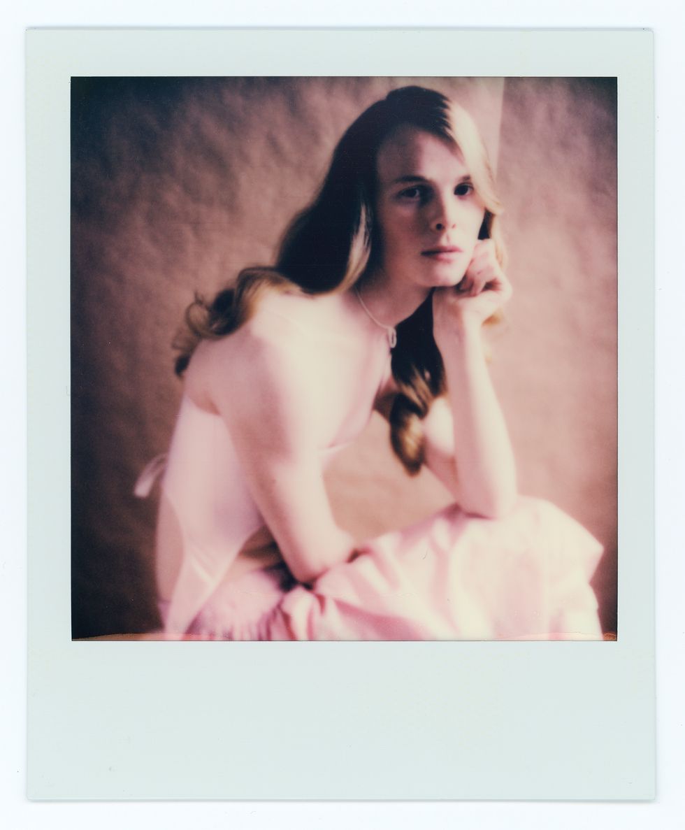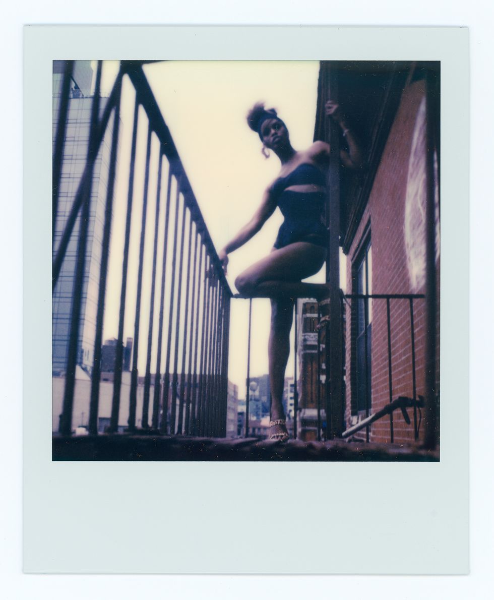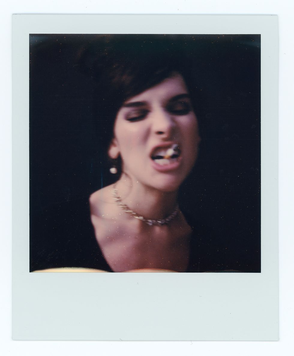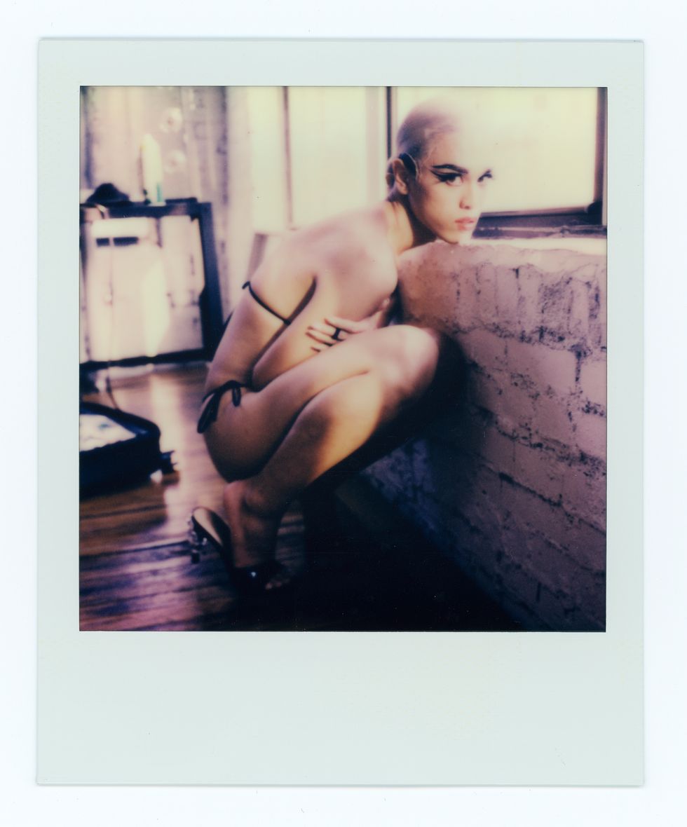 Green’s style runs the gamut from hazy, frenetic polaroids to crisp black-and-white portraiture, resembling, by turns, cult photographers like Joyce Baronio and the ecstatic glee of early Richard Avedon. Avedon loved and identified with his models deeply, but through a scrim of professionalism and gentlemanly distance. Green has no such tension. The relation between himself and his subjects is 1:1, with photographer and sitter both clearly egging each other on. His own experience as a male model is no doubt a major engine and source of empathy. With each shoot, Green takes his typical studio set-up and allows his ladies to chew it up and spit it back out. Simple compositions are blurred into fist-fight clouds of hairspray, falsies and rivers of inky black mascara. The view from Green’s Chinatown studio is timeless New York: all exposed red brick and questionably sound fire escapes. Taken together with their mock ’60s styling, his models look like they’ve escaped from a lost Warhol film — down-and-out socialites on an extended glamour bender.