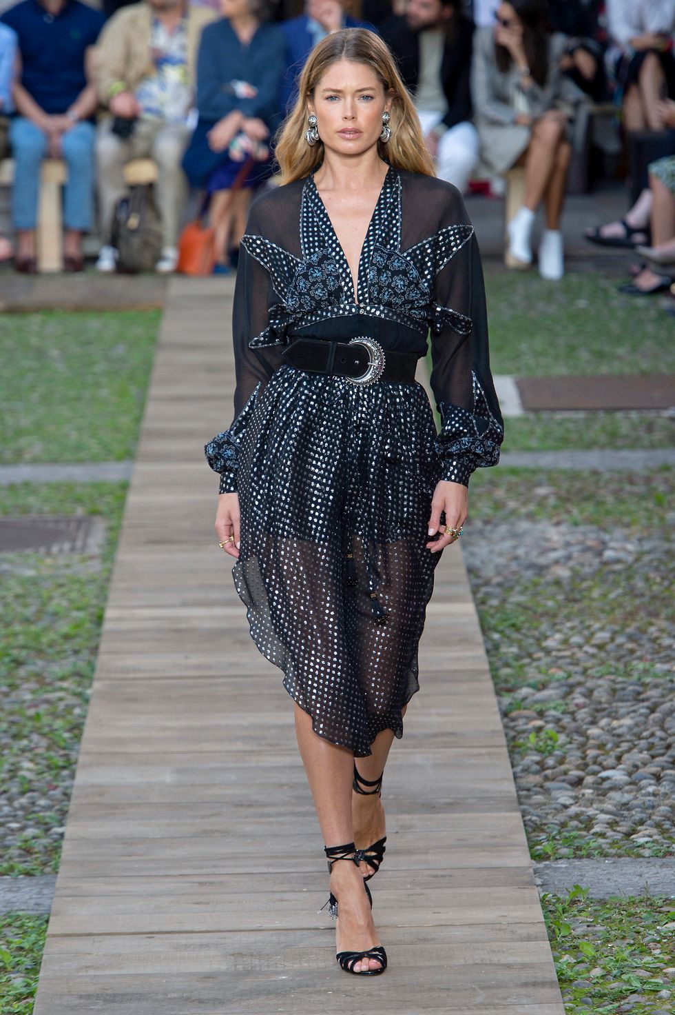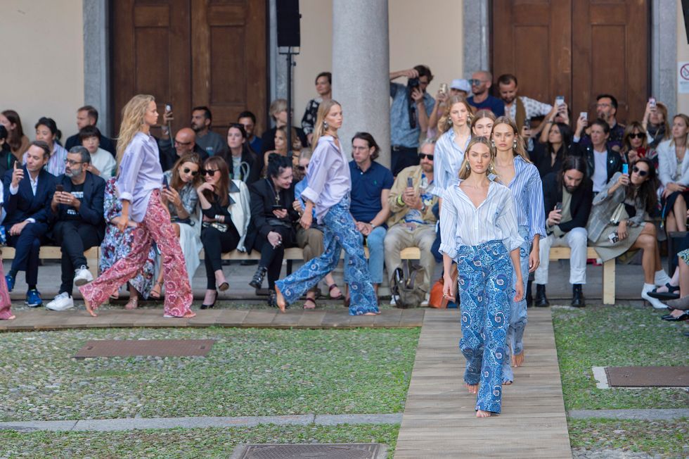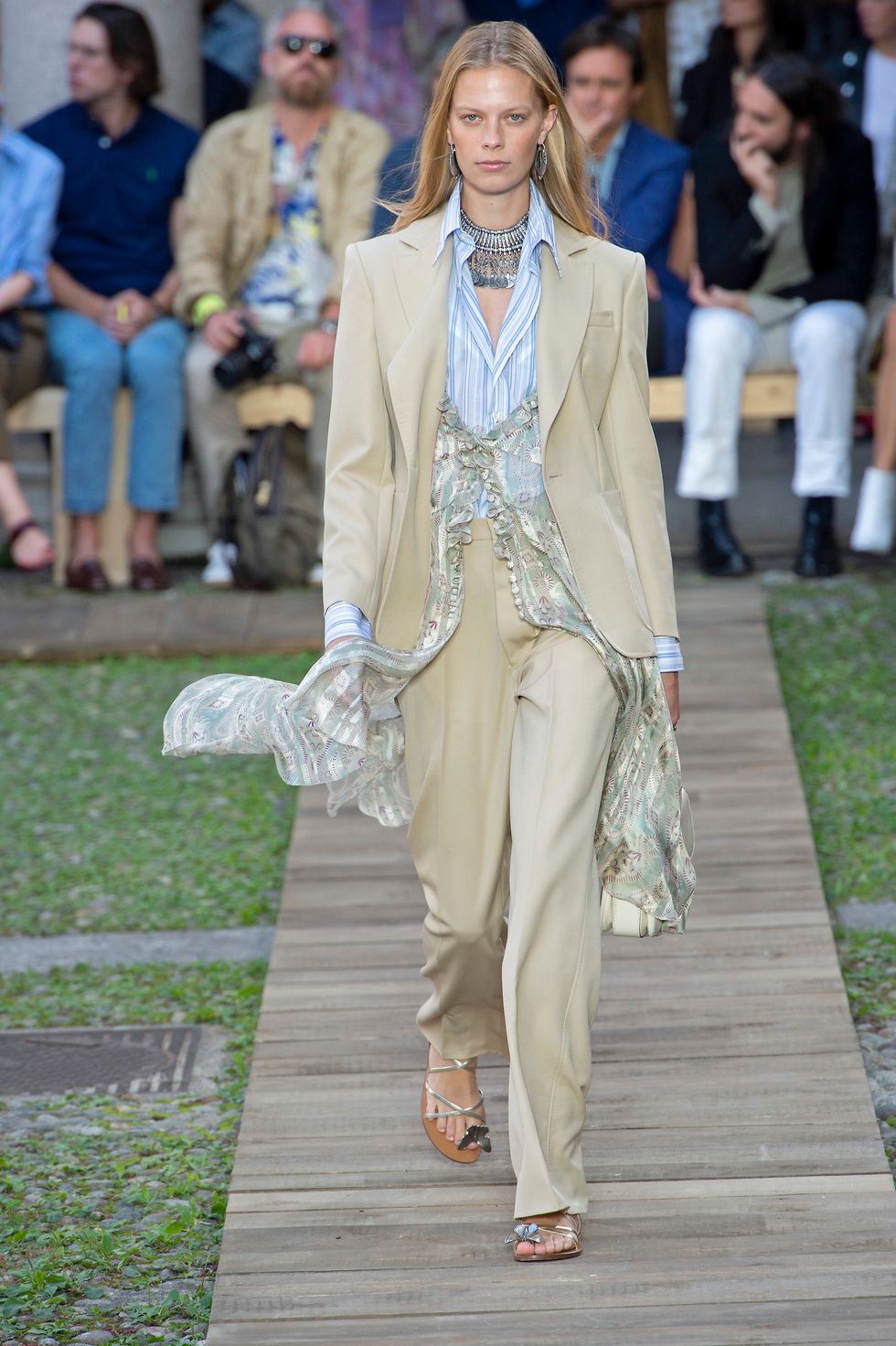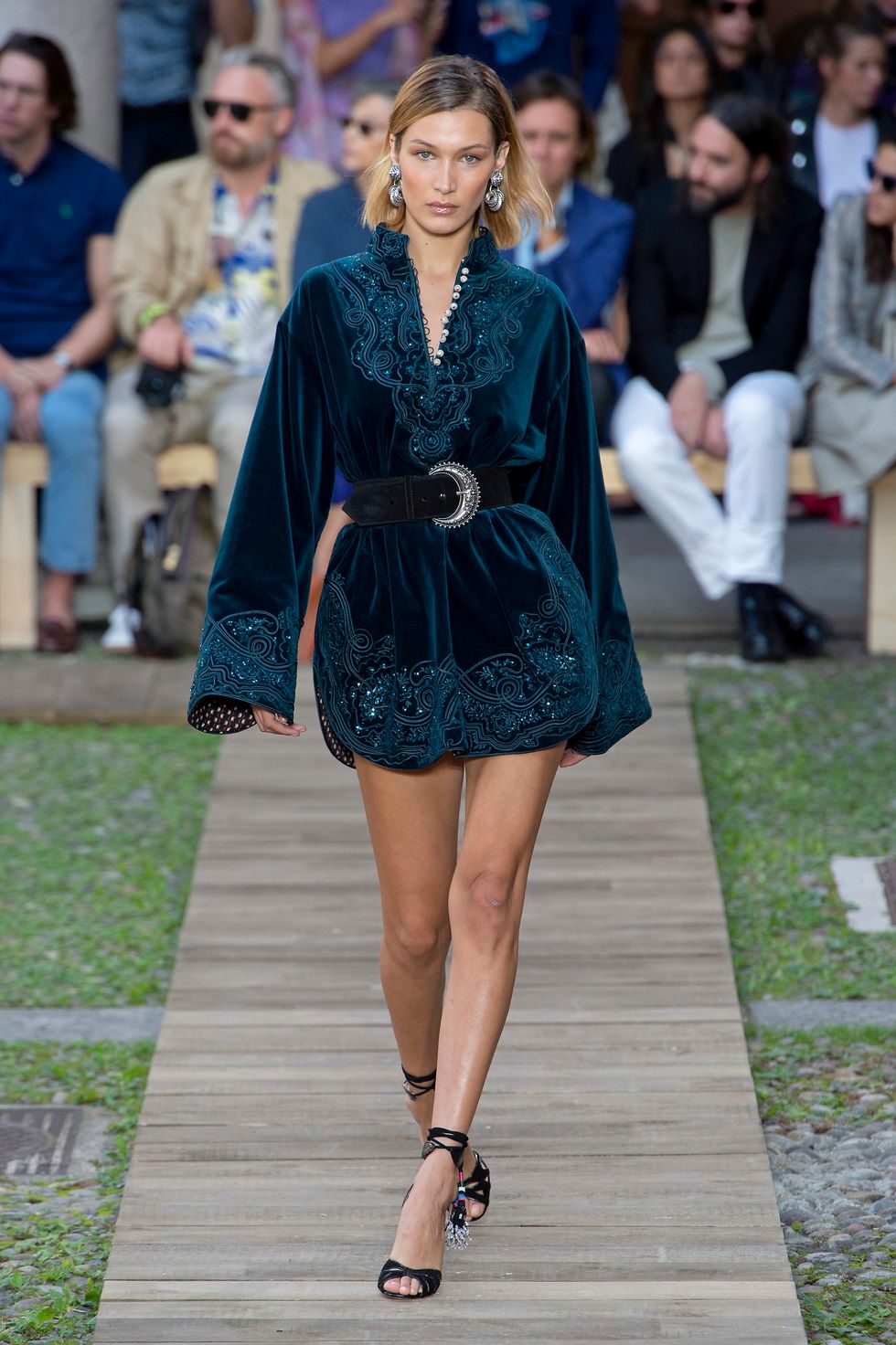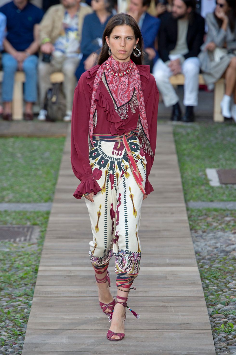 At Etro's Spring 2020 show in Milan, a parade of models emerged at the finale barefoot, strutting across the wooden boardwalk in paisley jeans and oversized crisp men's shirts. The term "boyfriend jeans" and "boyfriend shirts" gets tossed around a lot, but Etro is making a strong case for borrowing from the guys this season, with modern details (enlarged cuffs) and styling cues (tucked in slightly) feeling very of-the-moment. What preceded the finale was a lineup of the brand's signature bohemian, '70s flair and rich fabrications. Here's everything else you need to know about the collection.