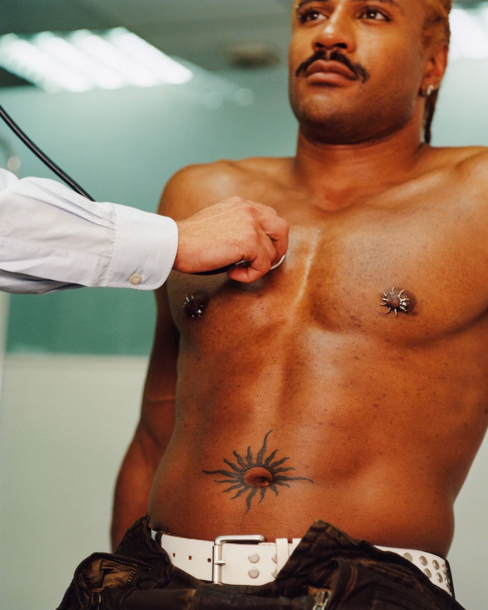 For SMUT II, I knew I wanted to do something about gay culture. I just didn’t know what it was yet, and then about two summers ago, I really sat down and had a think. I went to the Bishopsgate Institute in Liverpool Street [in London]. They have an amazing LGBT archive, and I was looking at a lot of things from the '80s and '90s gay magazines and vintage posters. At the same time, I was on a shoot at a lake just outside of London, and at the station, there was a sign on the men’s toilet door saying, "Closed due to inappropriate use of facilities." I was like, Hold on, the universe is telling me something right now. I need to hone in on what’s happening. And then later I was scrolling on TikTok and came across a "sleep stream," which is where someone sleeps on a livestream while viewers tip to try to get them to show more skin or to wake them up. It was a real mix of research and weird coincidences in my life.