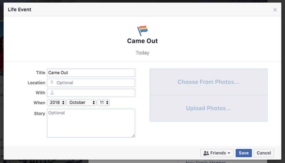 You can now add "coming out" with your sexual orientation or gender as a "major life event" to your Facebook timeline, alongside things like graduating, getting married and starting a new job.