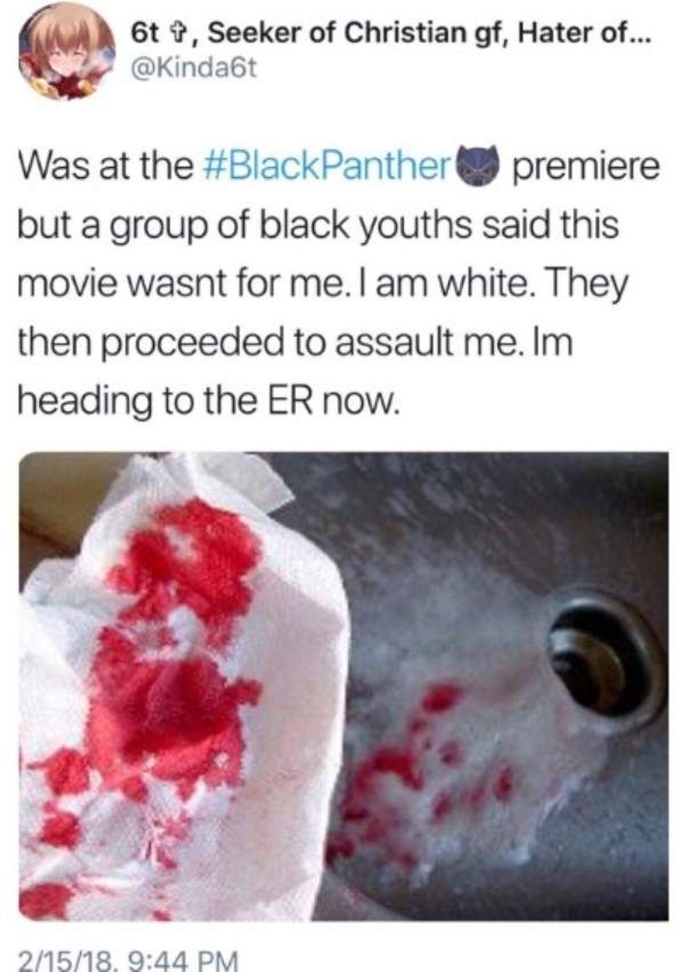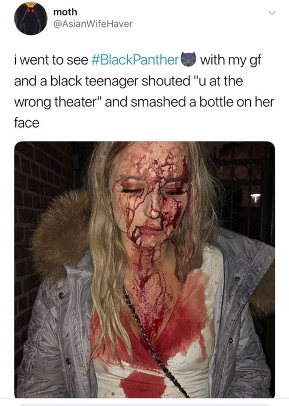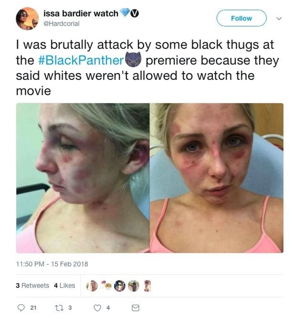 Trolls are claiming that Black Black Panther viewers are beating up their white counterparts at screenings of the film, and using real pictures of abused people to do so. #FakeBlackPantherAttacks began trending on Twitter as more people jumped in on the hoax. While most of the tweets fabricating assault have been deleted, screenshots are forever.