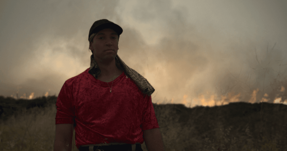 Khan notes that her collaboration with James was a seamless one, fueled by the energy present on set. "The relation between Micah and the environment continues to diverge, as he sashays through a field," she explains. "I felt the hills in the distance needed to be set ablaze to match Micah's strong performance. I digitally added fire to the scenes, and it felt like it was that thing you didn't know was missing until you saw it [...] The end presents a stark minimalism with Micah at its center; reborn from the ashes with a new found assurance."