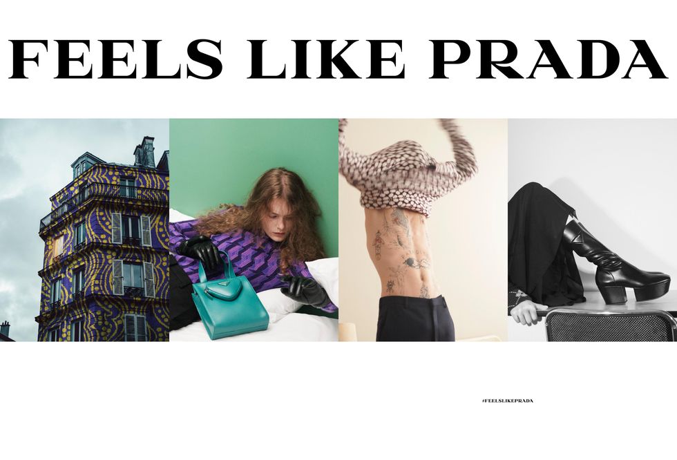 What feels like Prada to you? Is it the nylon shoulder bags making an appearance on the crook of every It-girl's arm? Is it the rare co-designing union between Miuccia Prada and Raf Simons? Or is it something more — an indescribable feeling you can only express when wearing the Italian house's clothing? For Prada's Fall 2021 campaign, the label asks what role they play in our own lives. Assembled using both Women's and Men's Fall 2021 collections shot by David Sims, a series of mood boards set the tone for uncovering what Prada boils down to. For a brand so shrouded in rich heritage and history, what are the new symbols and feelings associated with a recent overhaul? The layout feels reminiscent of a 2014-era Tumblr archive, with different aesthetics, textures, colors and patterns coming together to present a unique gaze at what makes Miuccia and Raf's Prada so recognizable.