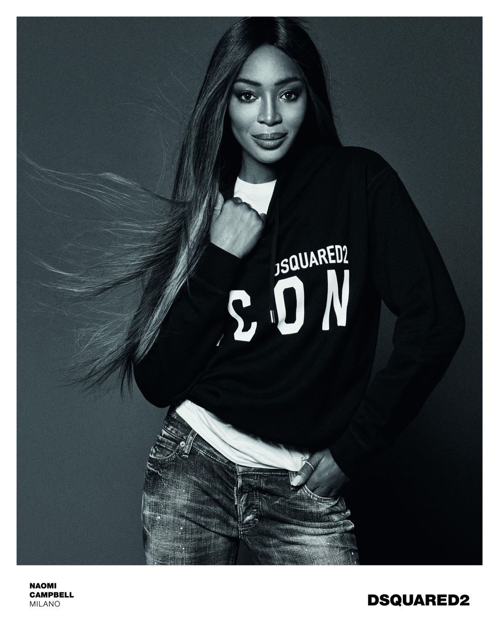 Following last season's campaign starring Cher, the latest face of Dsquared2's "Icons" series is none other than Naomi Campbell, who has a long history with the brand (including walking its famous airplane fashion show). The black and white portraits were shot in Milan by Giampaolo Sgura and show the supermodel pared down in jeans and t-shirts and hoodies.