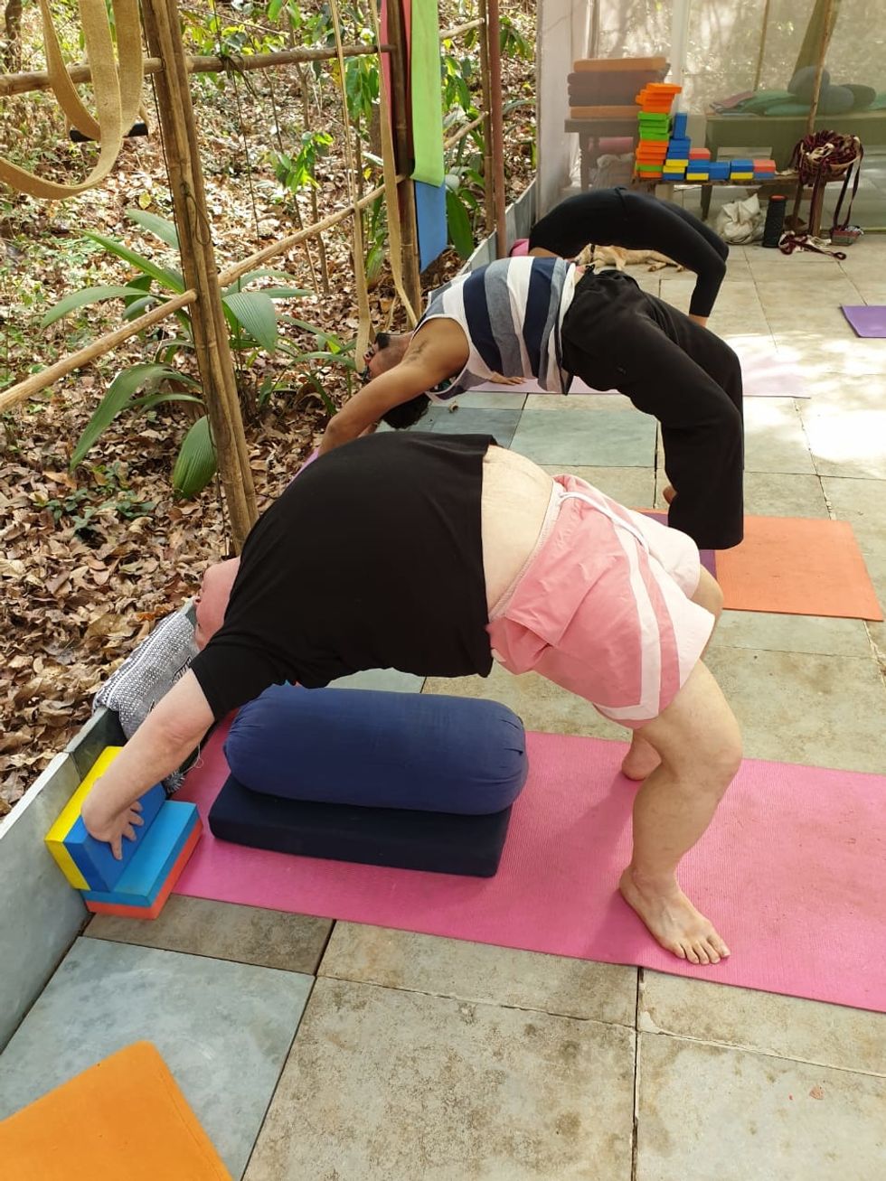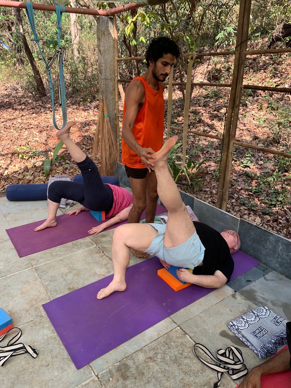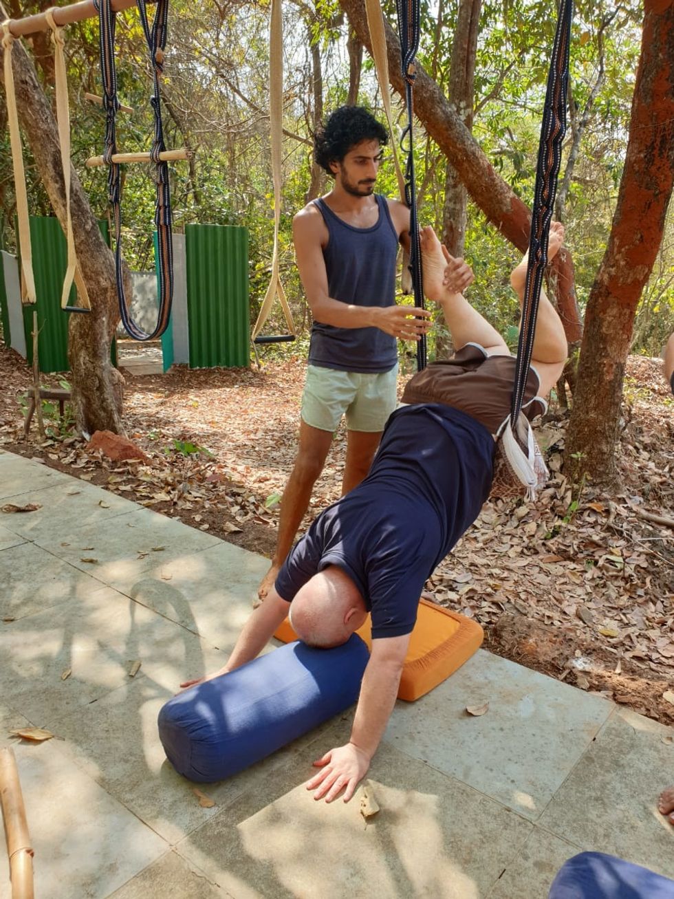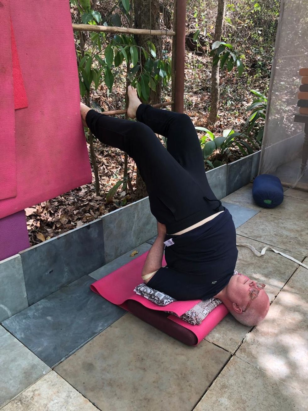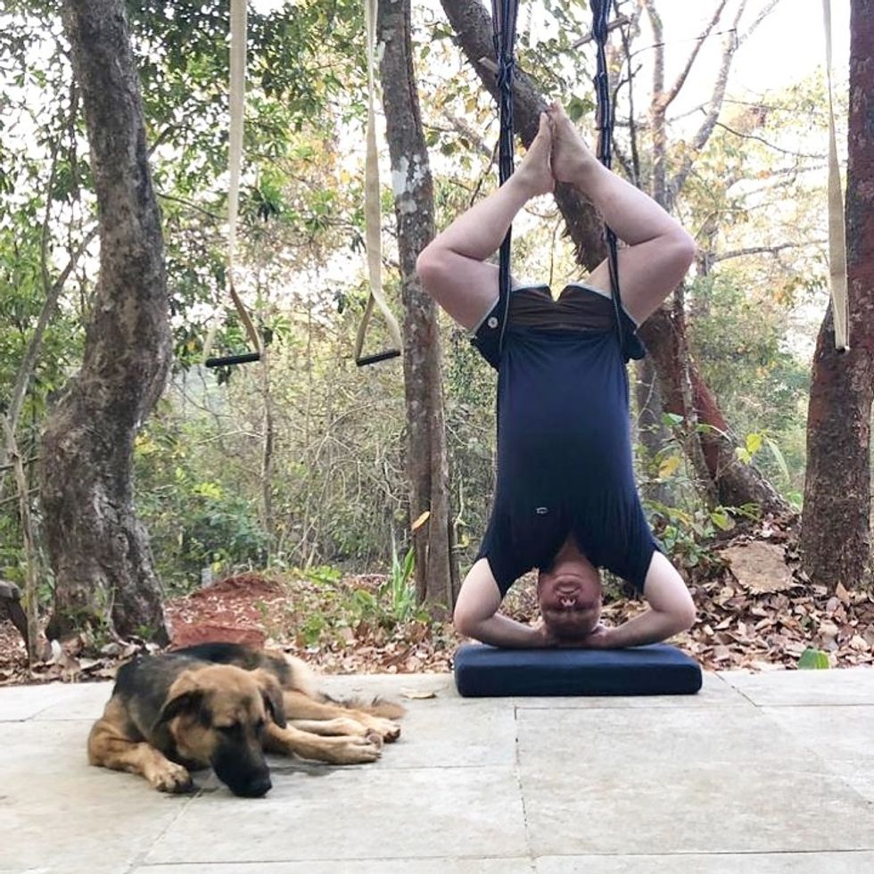 At my second yoga intensive in Goa, the yoga class took place up a hill in the jungle under a canopy of trees that were usually filled with frolicking monkeys. It was like being on a deserted island. For this intensive, we did inversions every day and I must say, after the backbend, the inversions are my favorite. People see photos of me hanging upside down by a strap and think I must be so advanced, but really there's nothing to it except trusting your instructor. You just lean back on your upside down. Fold your legs in and you're done. The less you think about it, the better. When I was a child I was obsessed with the idea of standing on my head, which I never did. I fantasized about carrying around a little pillow so I could stand on my head anytime I felt stressed. Who knows? Maybe I did yoga in a past life. Whatever the case, nothing is more relaxing and invigorating than inversions. I come out of feeling like any stress has evaporated from my body and every part of me is stretched out and relaxed.