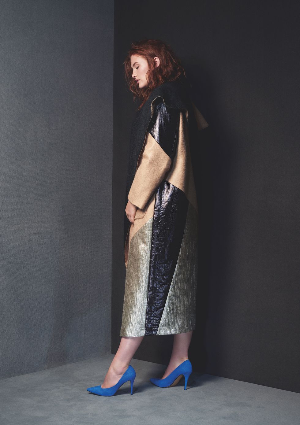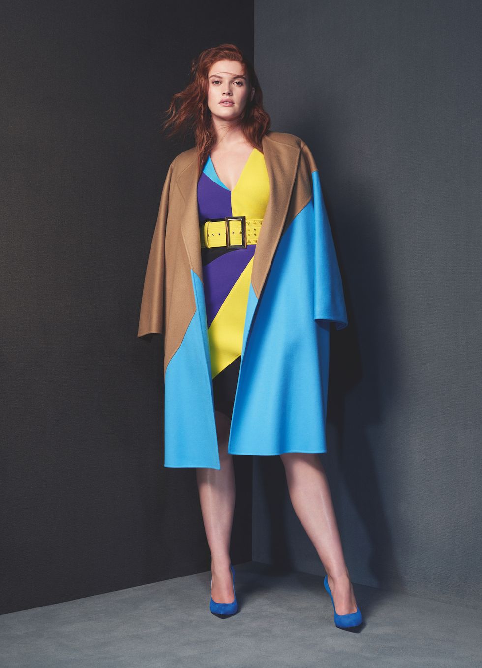 Puglisi's vibrant sense of color, penchant for geometry, and signature sexy cuts emboldens Marina Rinaldi's otherwise subtle, polished style. "I created a sexy, flamboyant collection because we all have a body to celebrate, to show off," Puglisi says, citing the brand's exclusivity in workmanship and materials, as opposed to size.