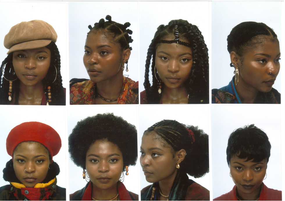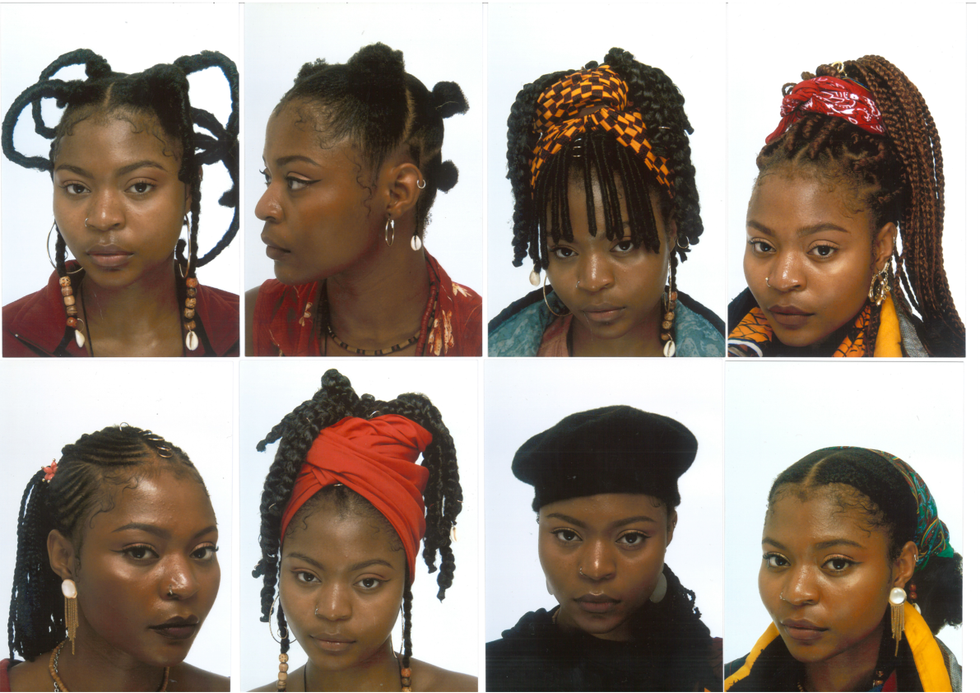 In her recent project, "A Statement of Pride," she photographs herself in a variety of different hairstyles that she does by herself. Each photograph is styled as a passport photo. Jonathan playfully gazes at the camera or captures a profile shot of her styled hair, subverting a generally detached format and infusing it with style, personality, and charm. The intersections of race and gender affect how black women's natural hair is policed in classrooms and offices, so Jonathan's celebration of her hair is an inherently political act. She tells me she is inspired by the natural hair movement, and by her own experiences realizing she doesn't have to use relaxer, a chemical that straightens hair, if she doesn't want to.