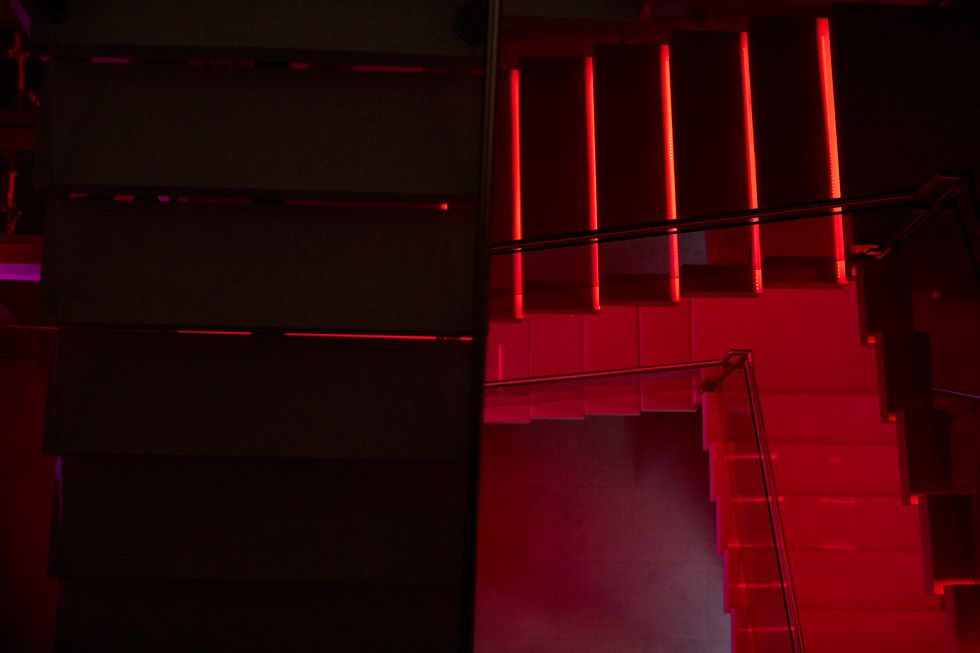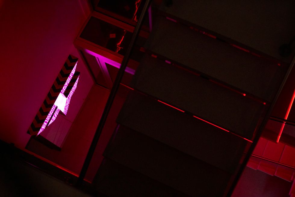 Up a steep drive in the Hollywood Hills sits a multistory mansion that stretches right up to the curb. It stands out from the neighboring houses in both size (it's so long that it wraps around a bend in the road) and stateliness (there are more balconies and glass panes than one could reasonably count). Inside, the spread is a cross between an opulent music-video set (think Lady Gaga's "Poker Face") and a Vegas nightclub. The winding staircases and hallways are backlit with neon. The uppermost deck has a pool and overlooks the lights of Los Angeles below. Oh, and there's an elevator.